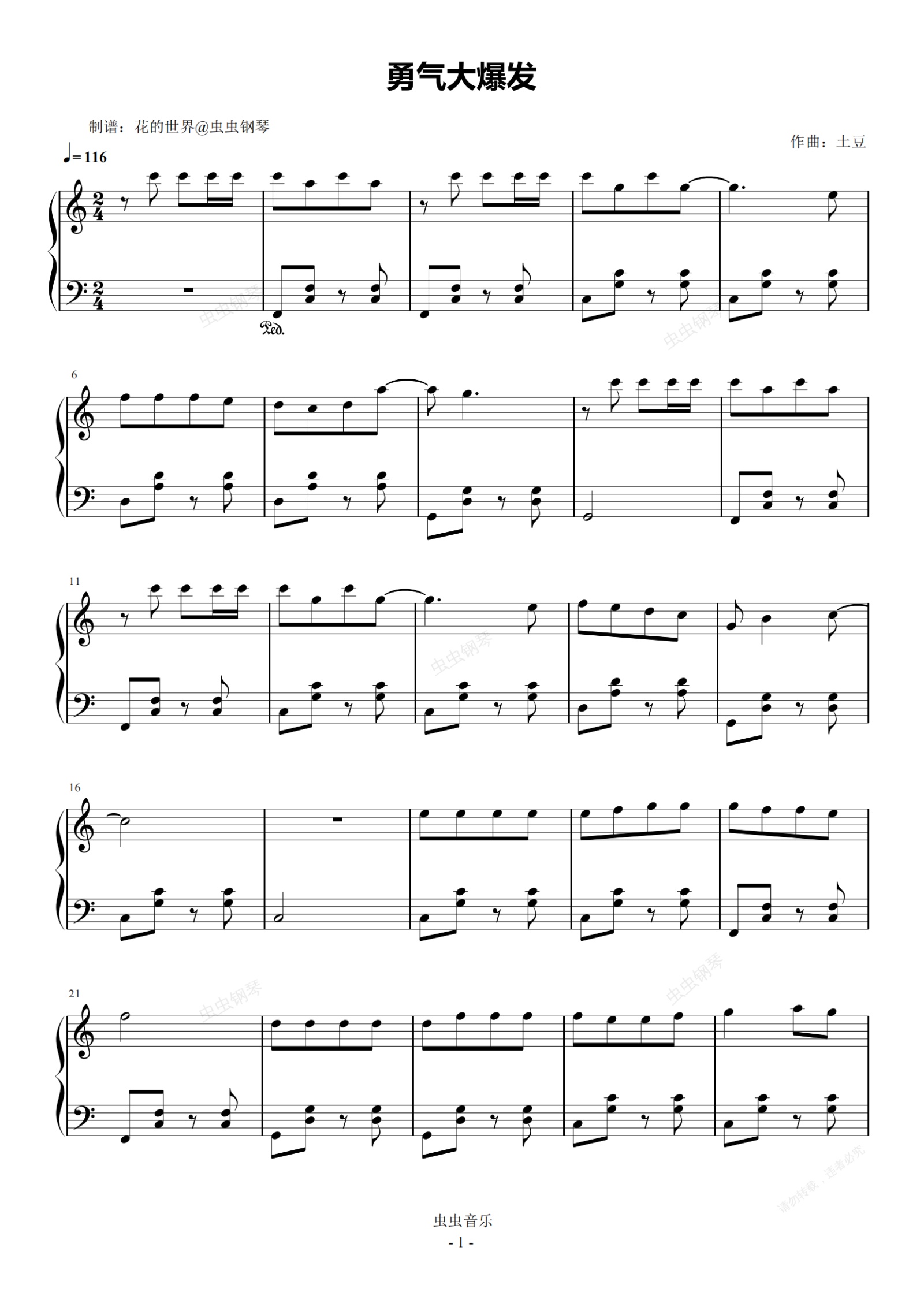 钢琴谱:勇气大爆发 C调简易 节奏版  贝乐虎、土豆王国小乐队、奶糖乐团
