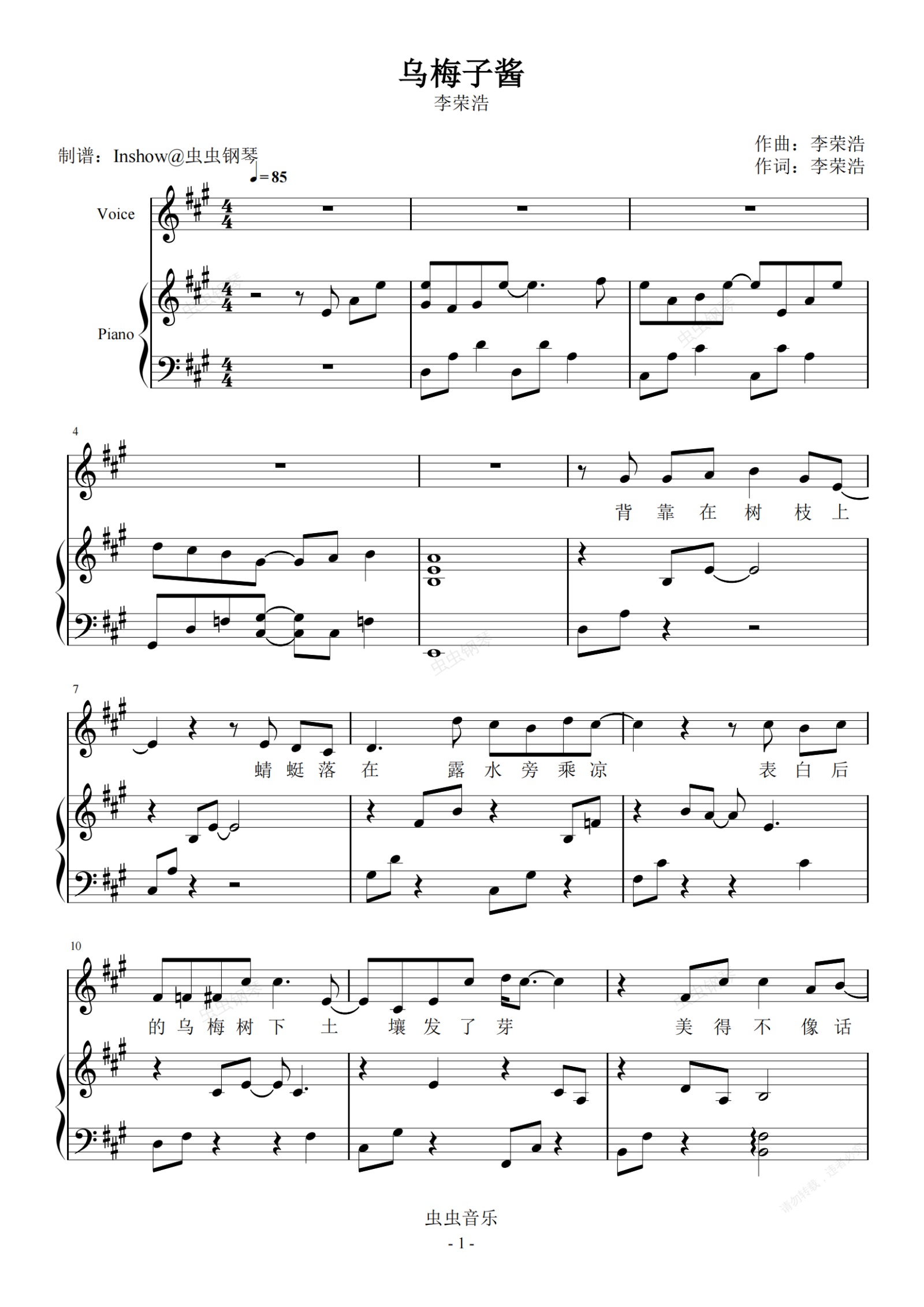 钢琴谱:乌梅子酱【弹唱】 - 李荣浩 -