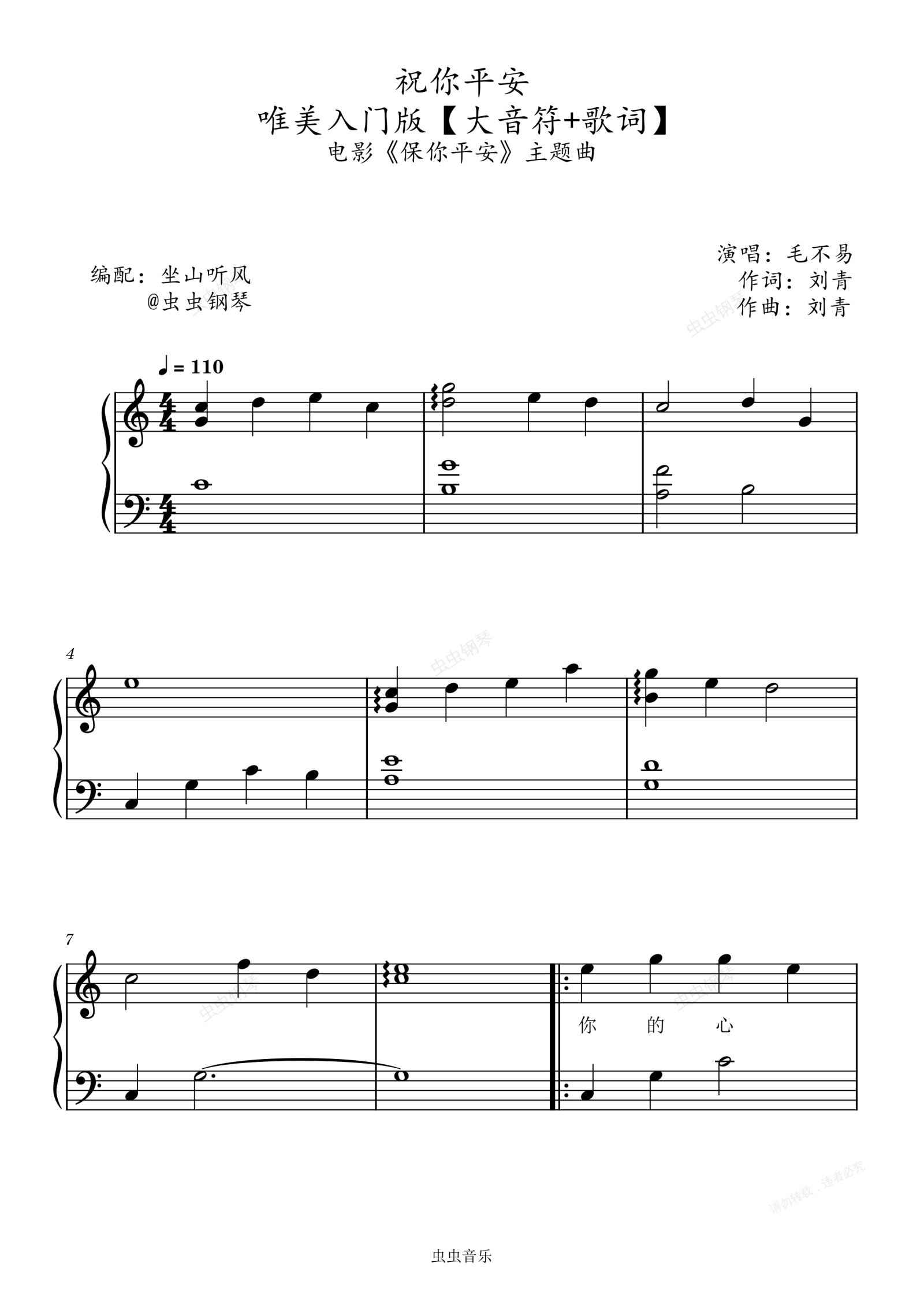 钢琴谱:祝你平安——唯美入门版【大音符+歌词】