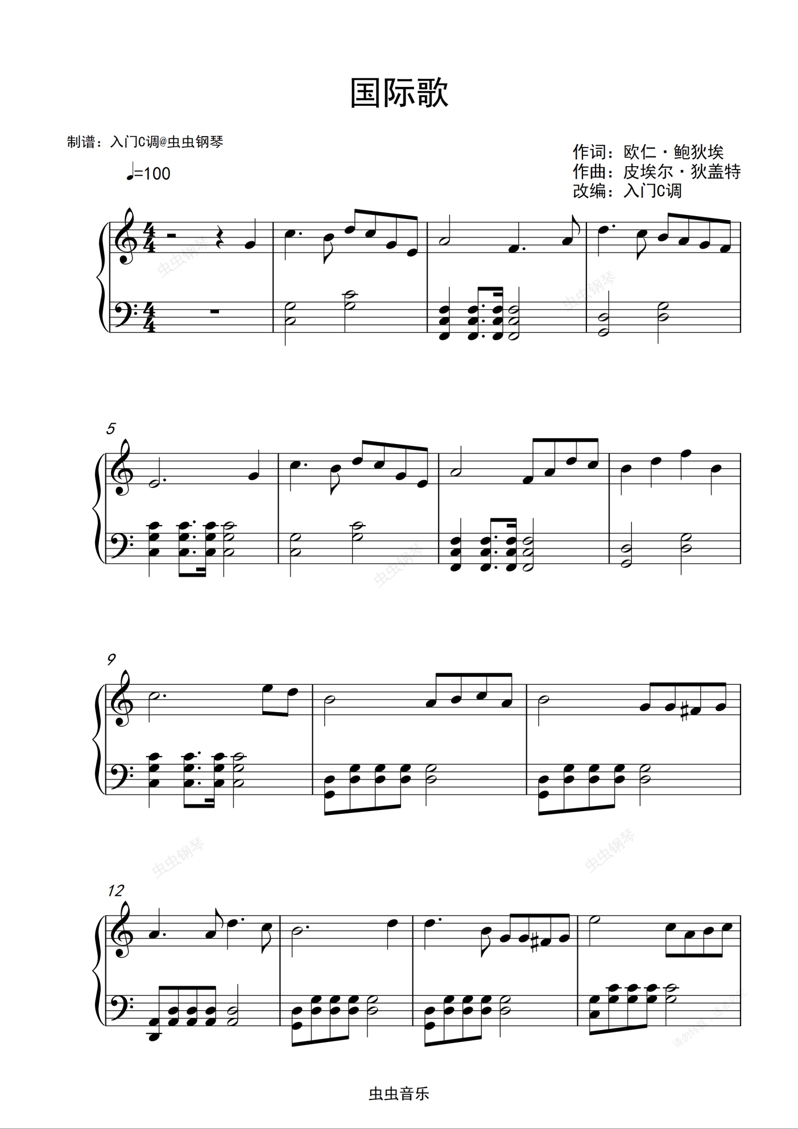 钢琴谱:《国际歌》入门C调简单版