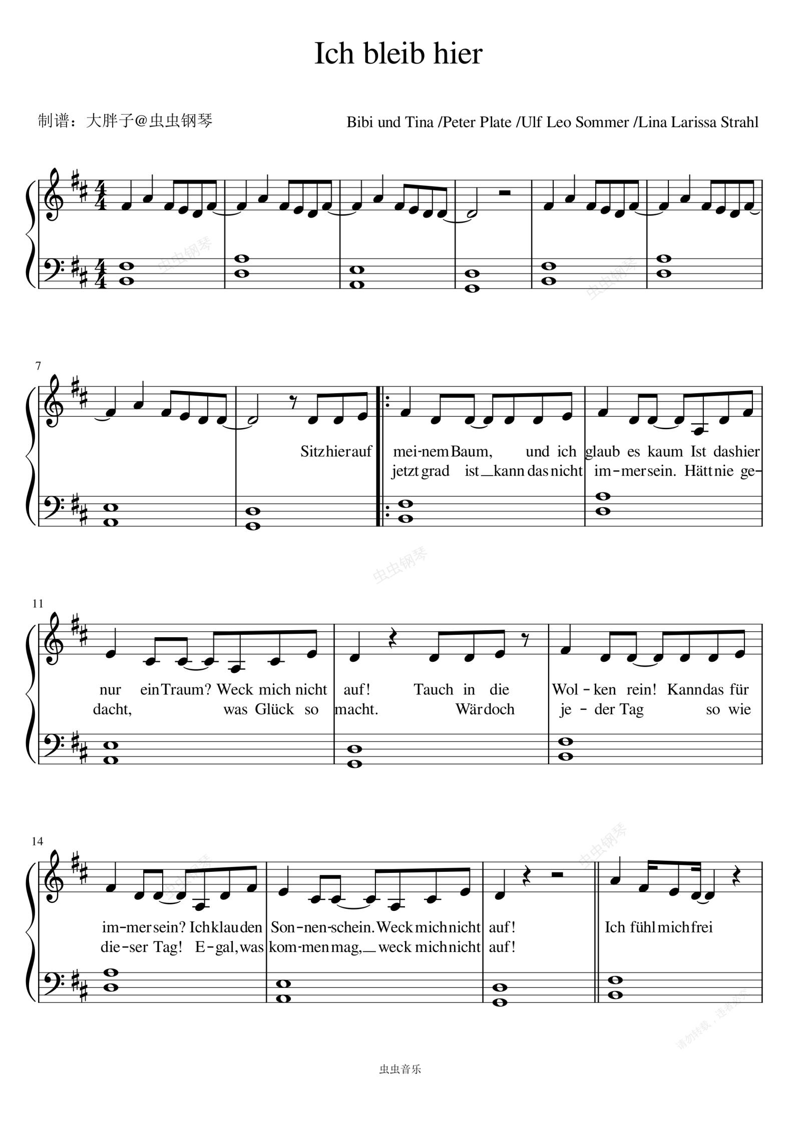 钢琴谱:Ich bleib hier - Bibi und Tina /Peter Plate /Ulf Leo Sommer /Lina Larissa Strahl