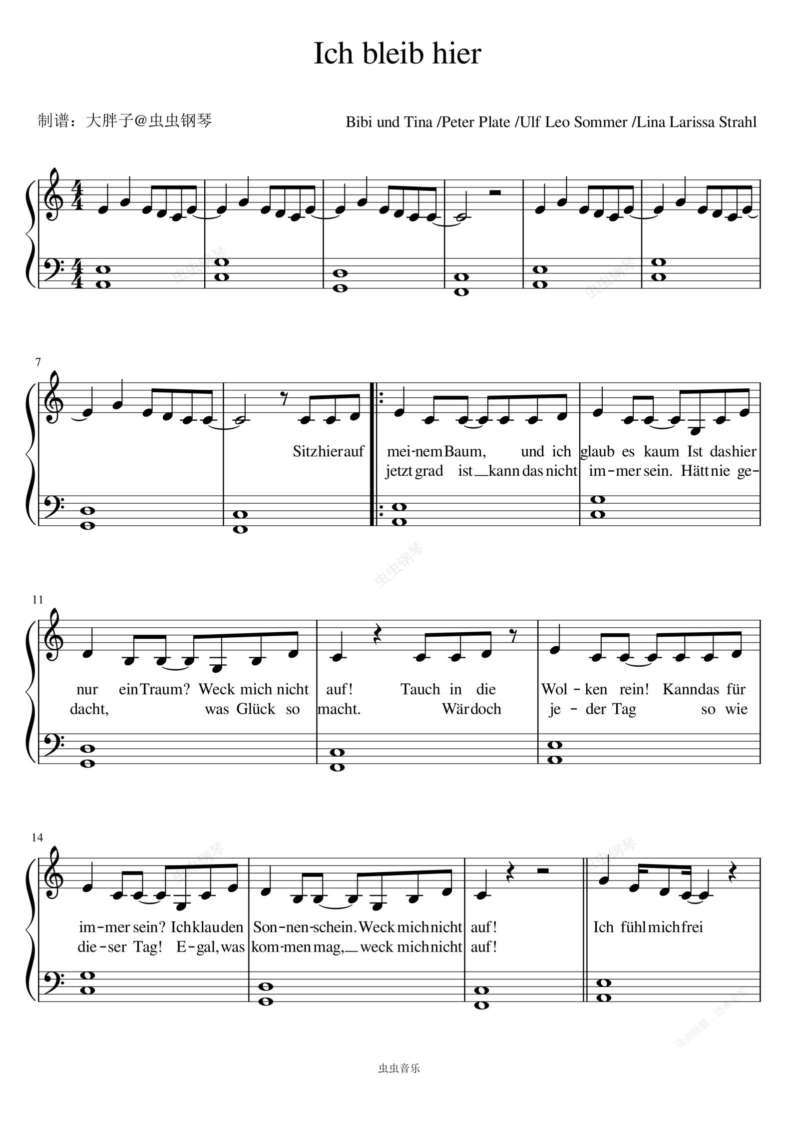 钢琴谱:Ich bleib hier - Bibi und Tina /Peter Plate /Ulf Leo Sommer /Lina Larissa Strahl