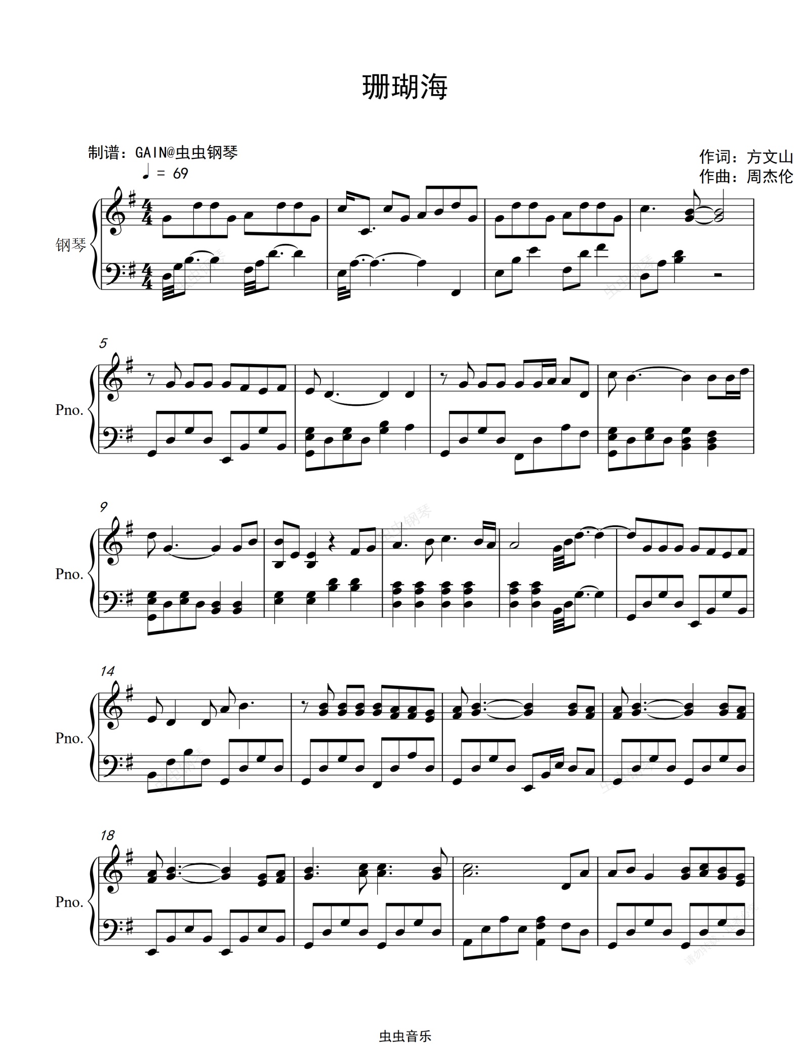 钢琴谱:珊瑚海-周杰伦/ 梁心颐