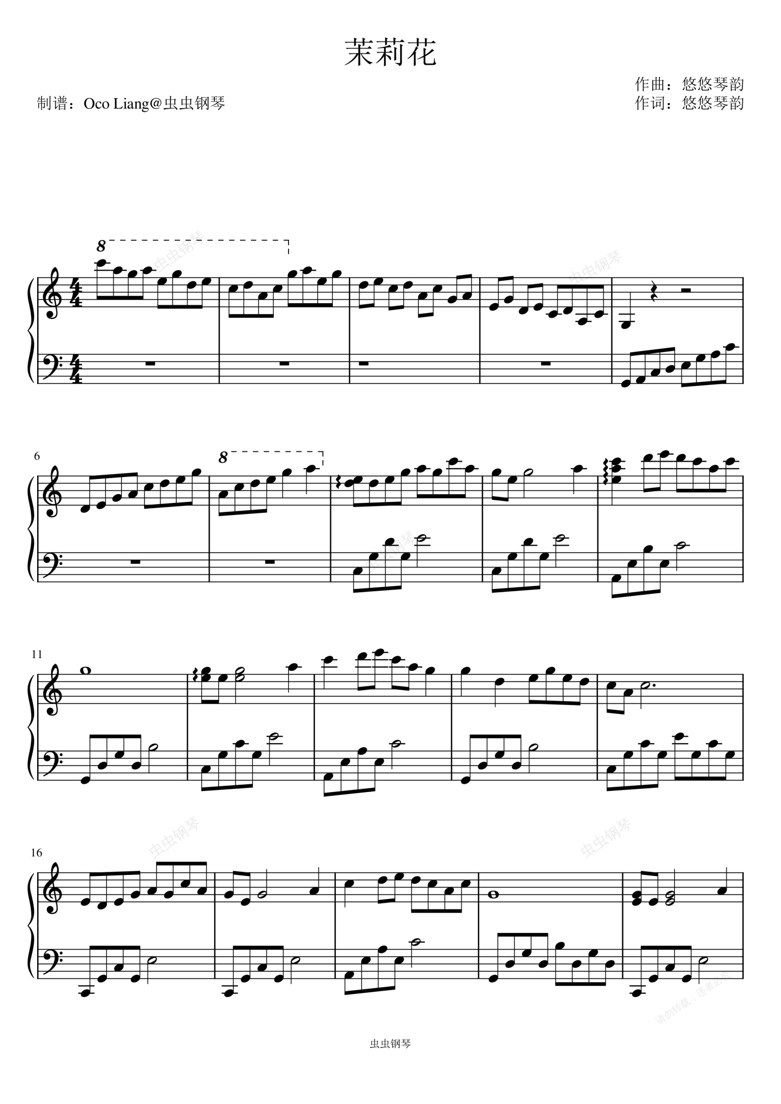 钢琴谱:茉莉花(C大调简化版)