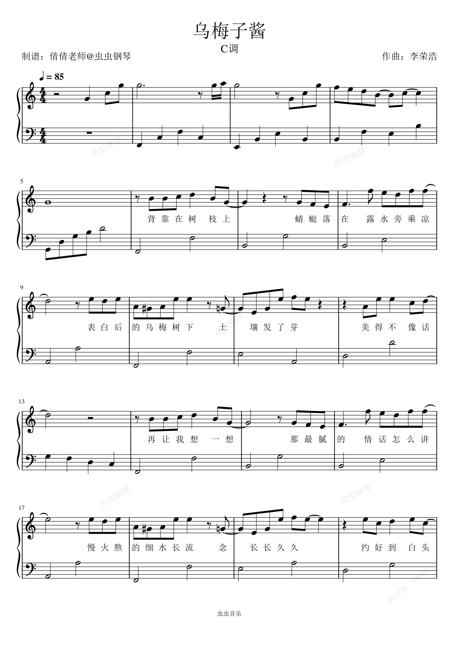 钢琴谱:乌梅子酱-C调简易-李荣浩