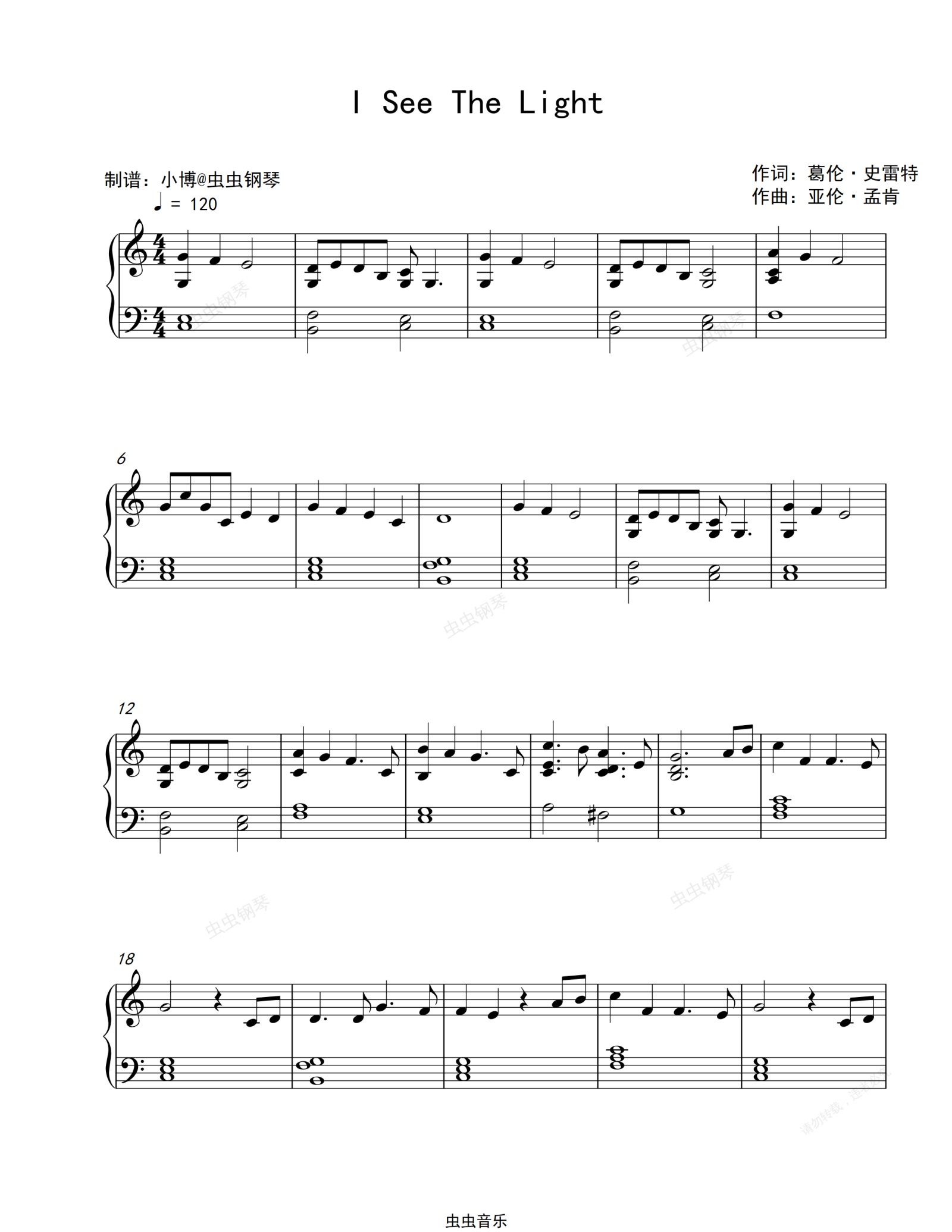 钢琴谱:I See The Light-C调简单版-Alan Menken