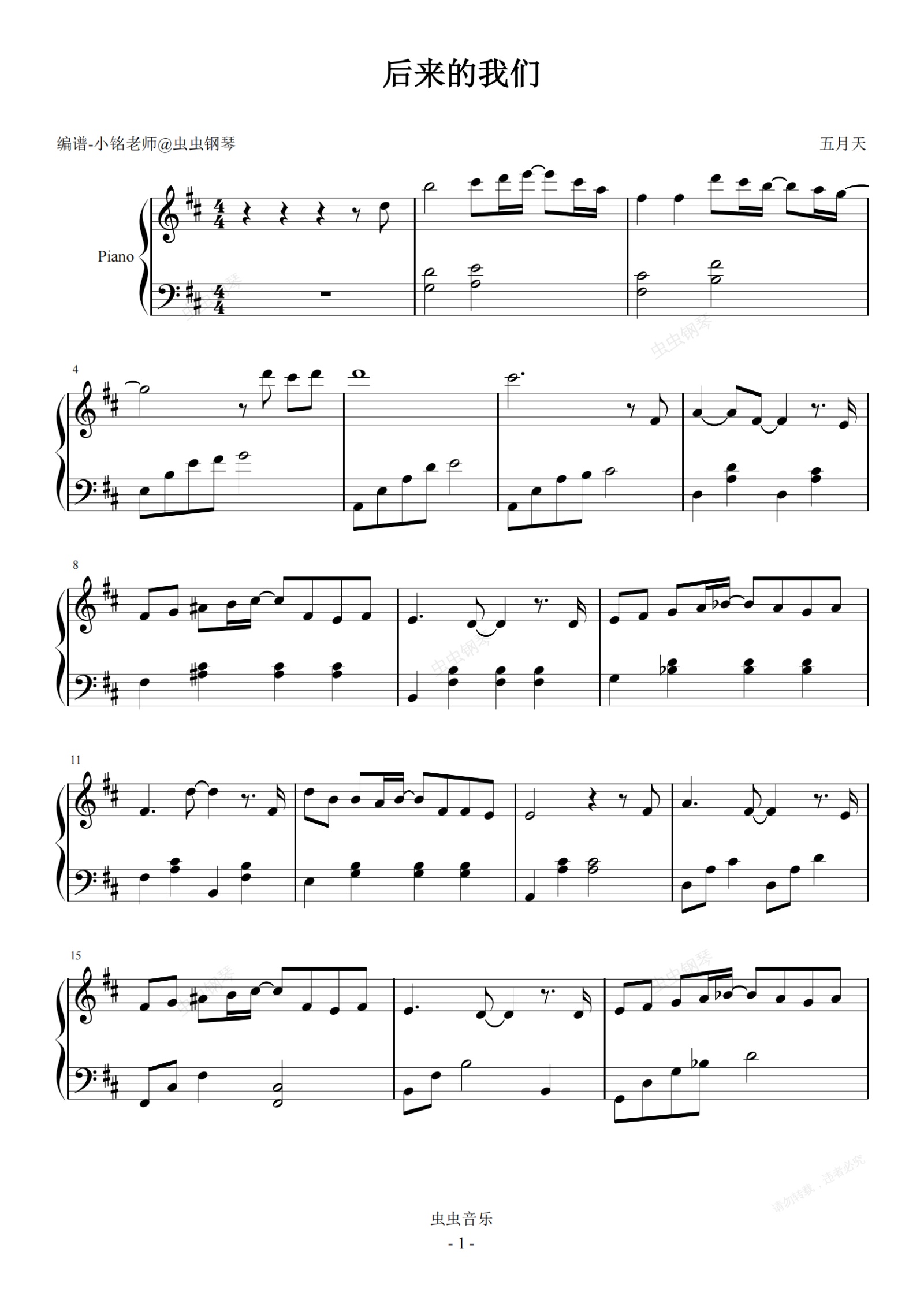钢琴谱:后来的我们【D调 简易