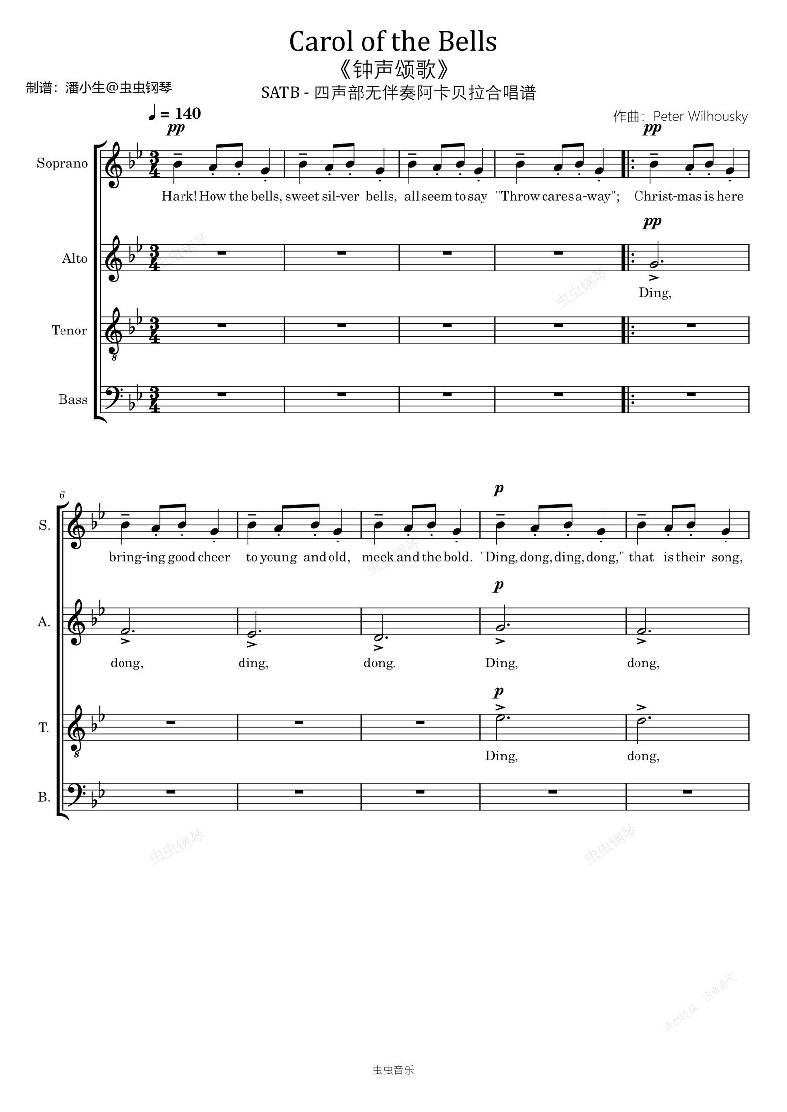 钢琴谱:Carol of the Bells 《钟声颂歌》SATB  人声无伴奏阿卡贝拉合唱谱 Acappella