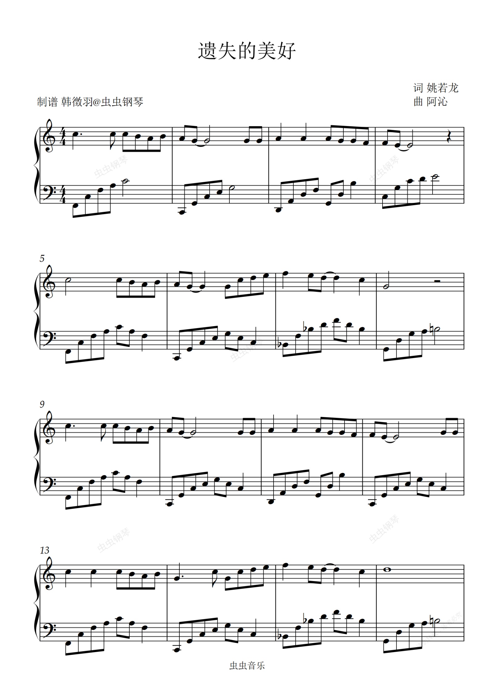 钢琴谱:遗失的美好 张韶涵 C调简单易弹