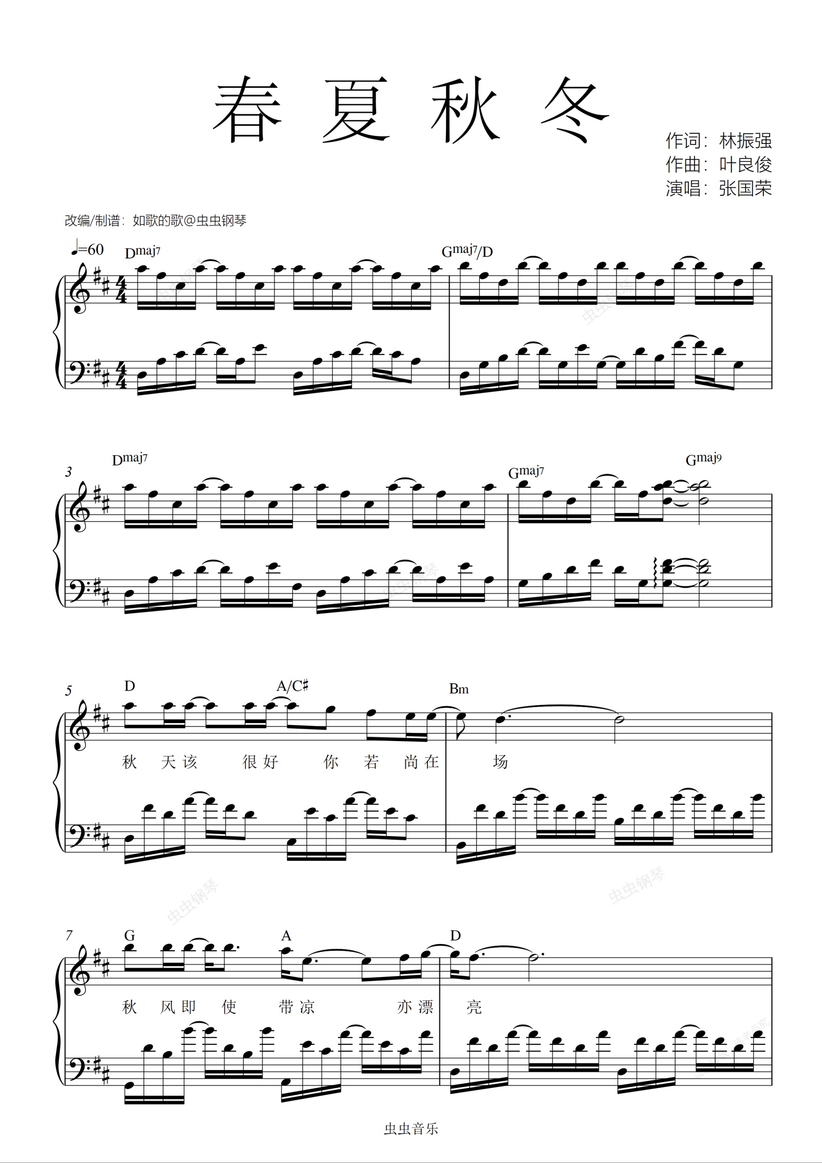 钢琴谱:春夏秋冬-D调附词功能可弹唱