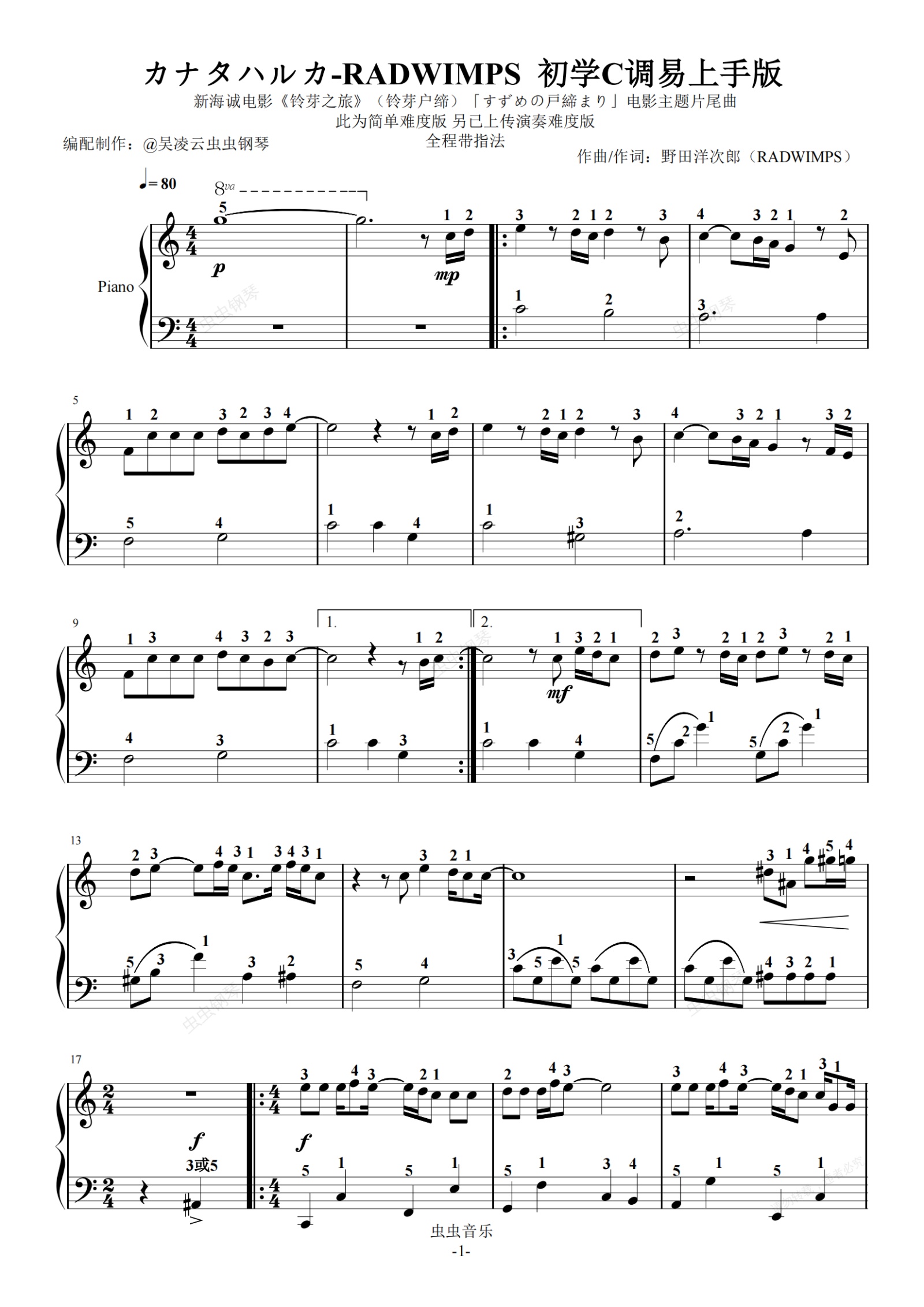钢琴谱:カナタハルカ-RADWIMPS 初学C调易上手版 新海诚电影《铃芽之旅》(铃芽户缔)「すずめの戸締まり」电影主题片尾曲