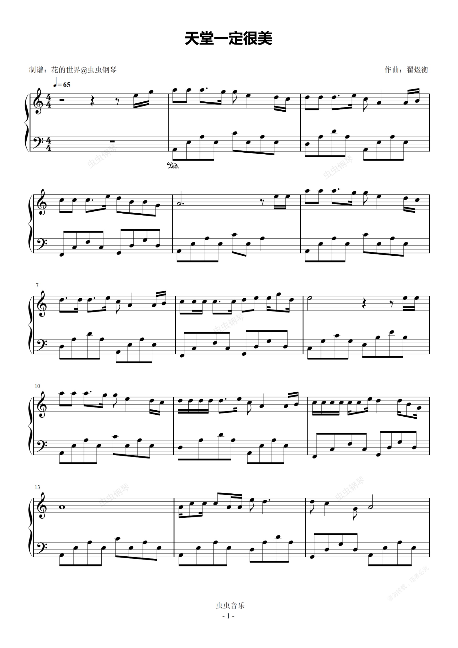 钢琴谱:天堂一定很美 C调简易版 -翟煜衡