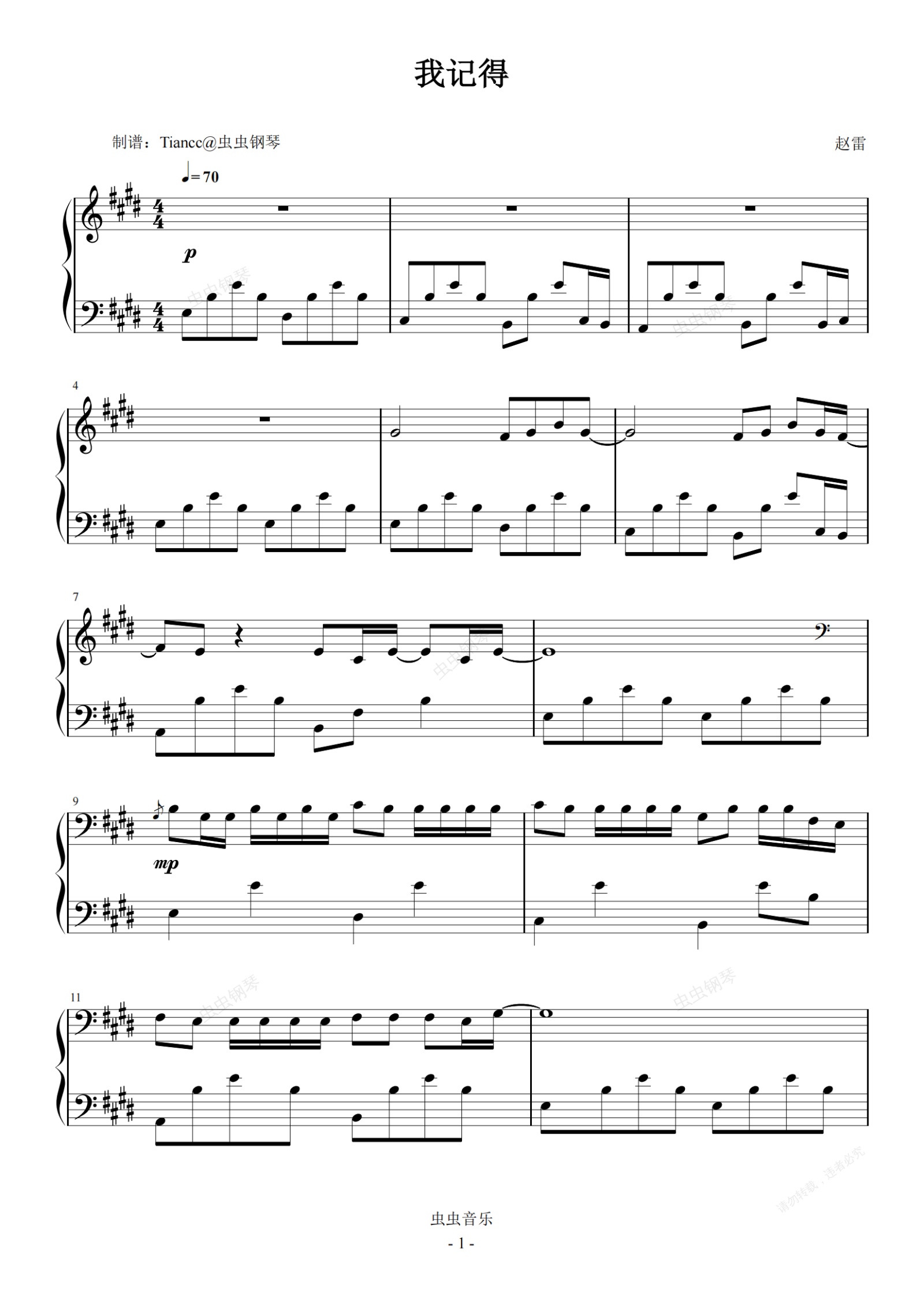 钢琴谱:《我记得》赵雷,O叔优化版