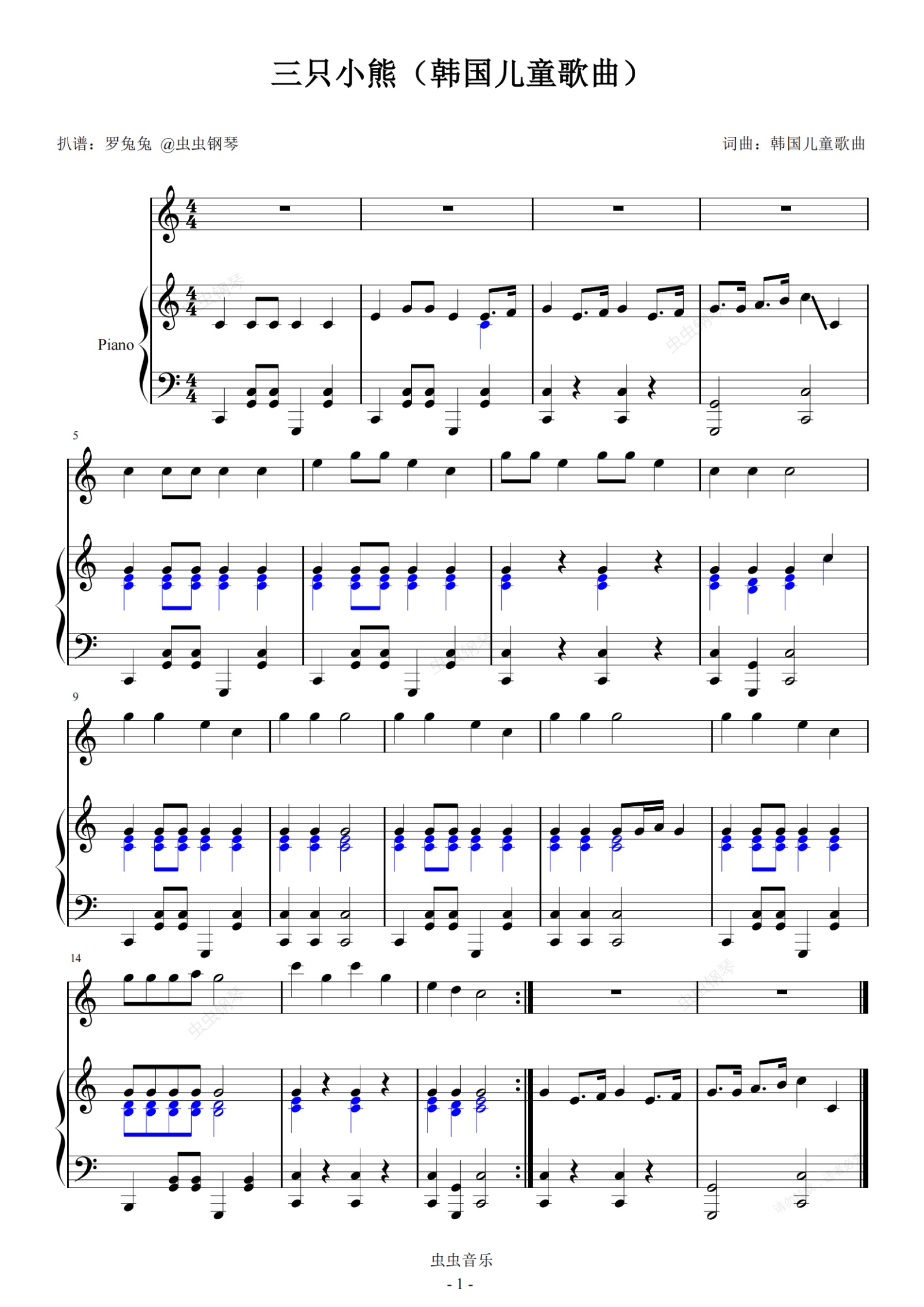 钢琴谱:三只小熊(韩国儿童歌曲)