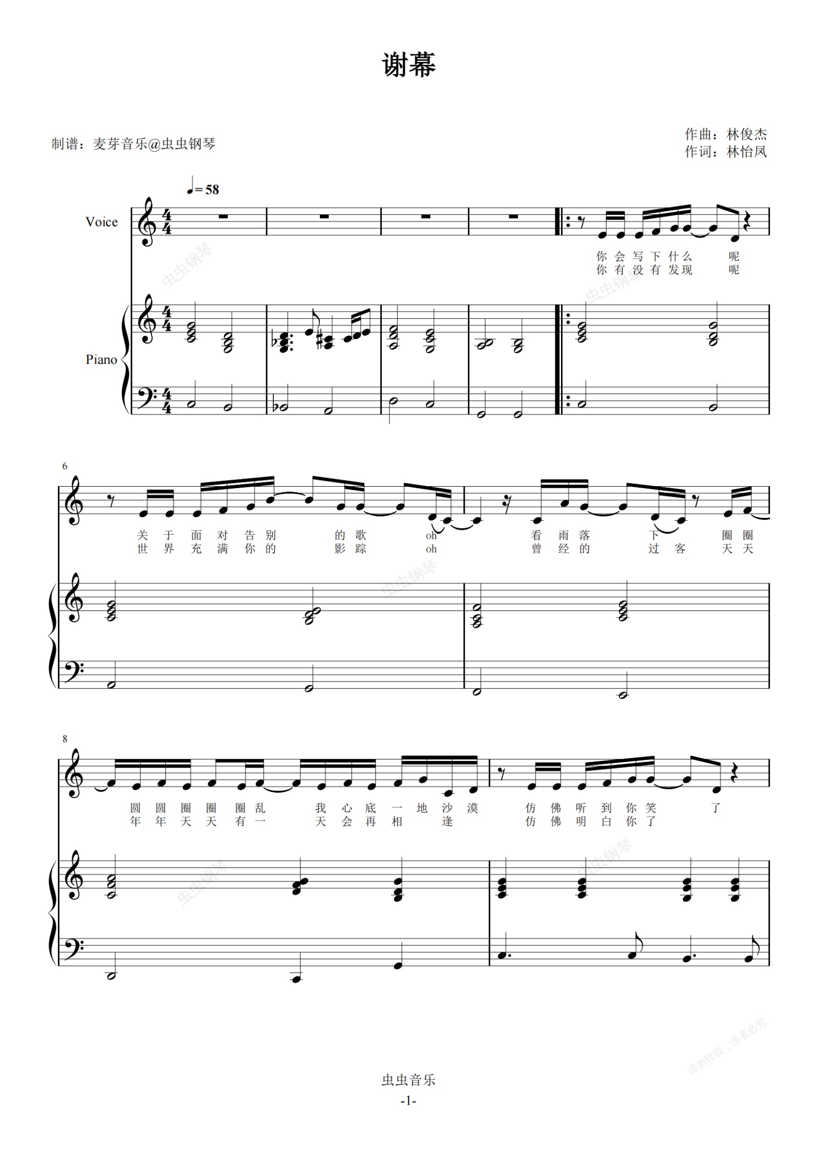 钢琴谱:谢幕C调弹唱