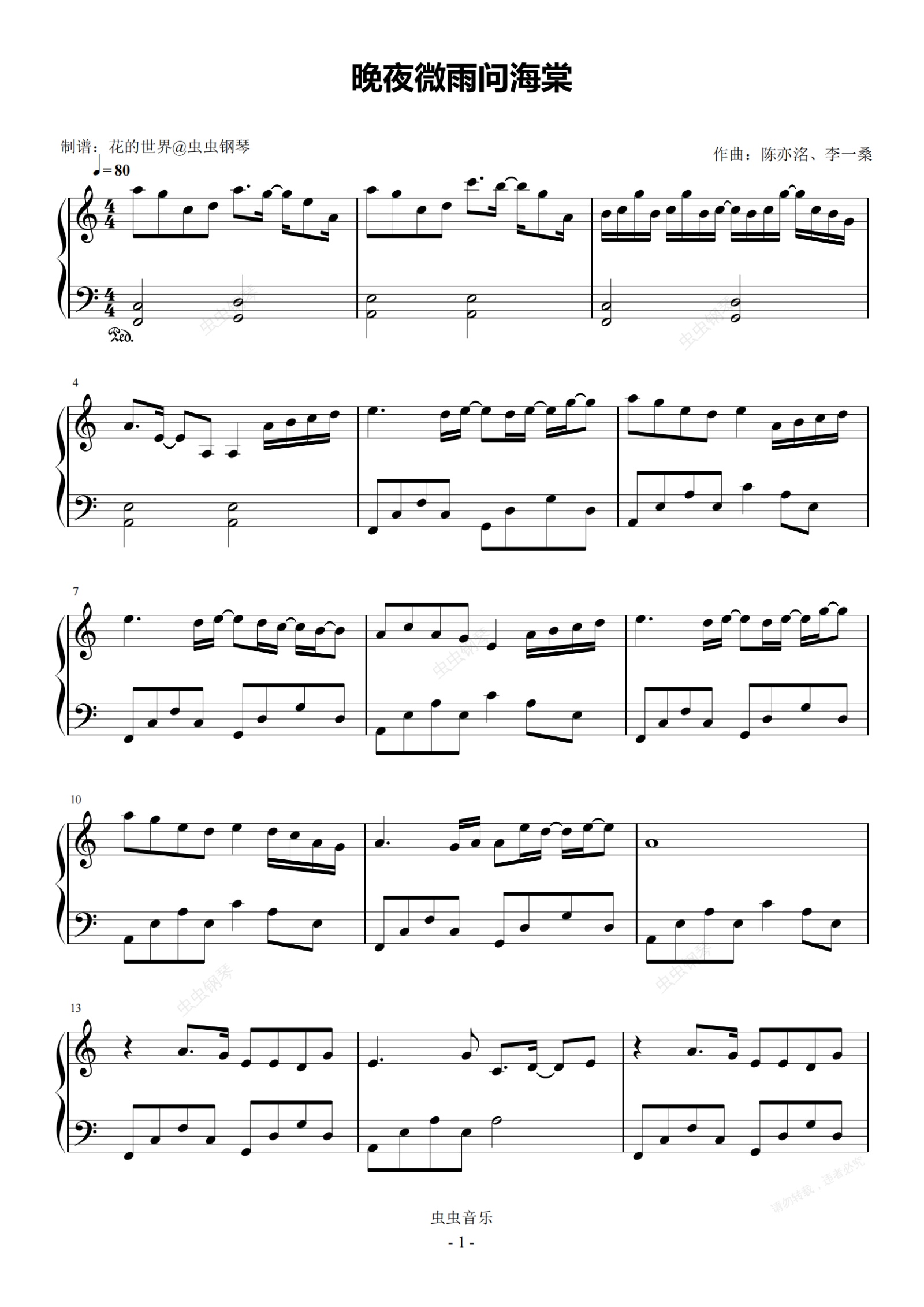 钢琴谱:晚夜微雨问海棠 C调简易版本  镜予歌、陈亦洺、喧笑