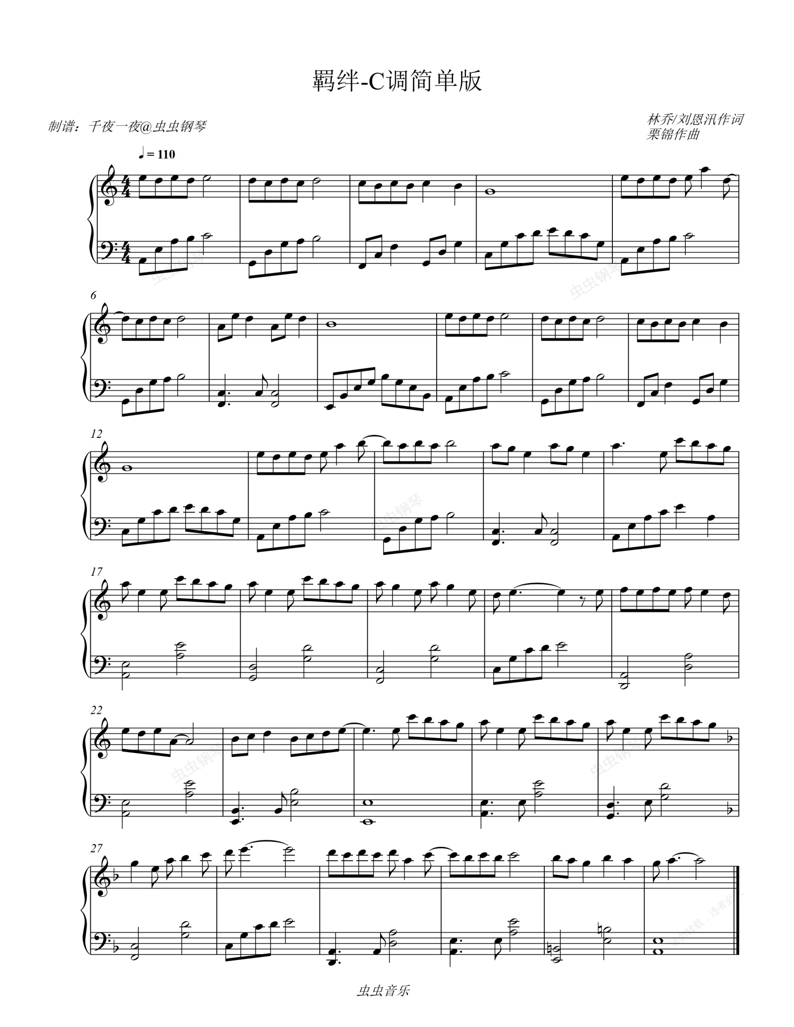 钢琴谱:羁绊-C调简单版-一片冰心在玉壶主题曲