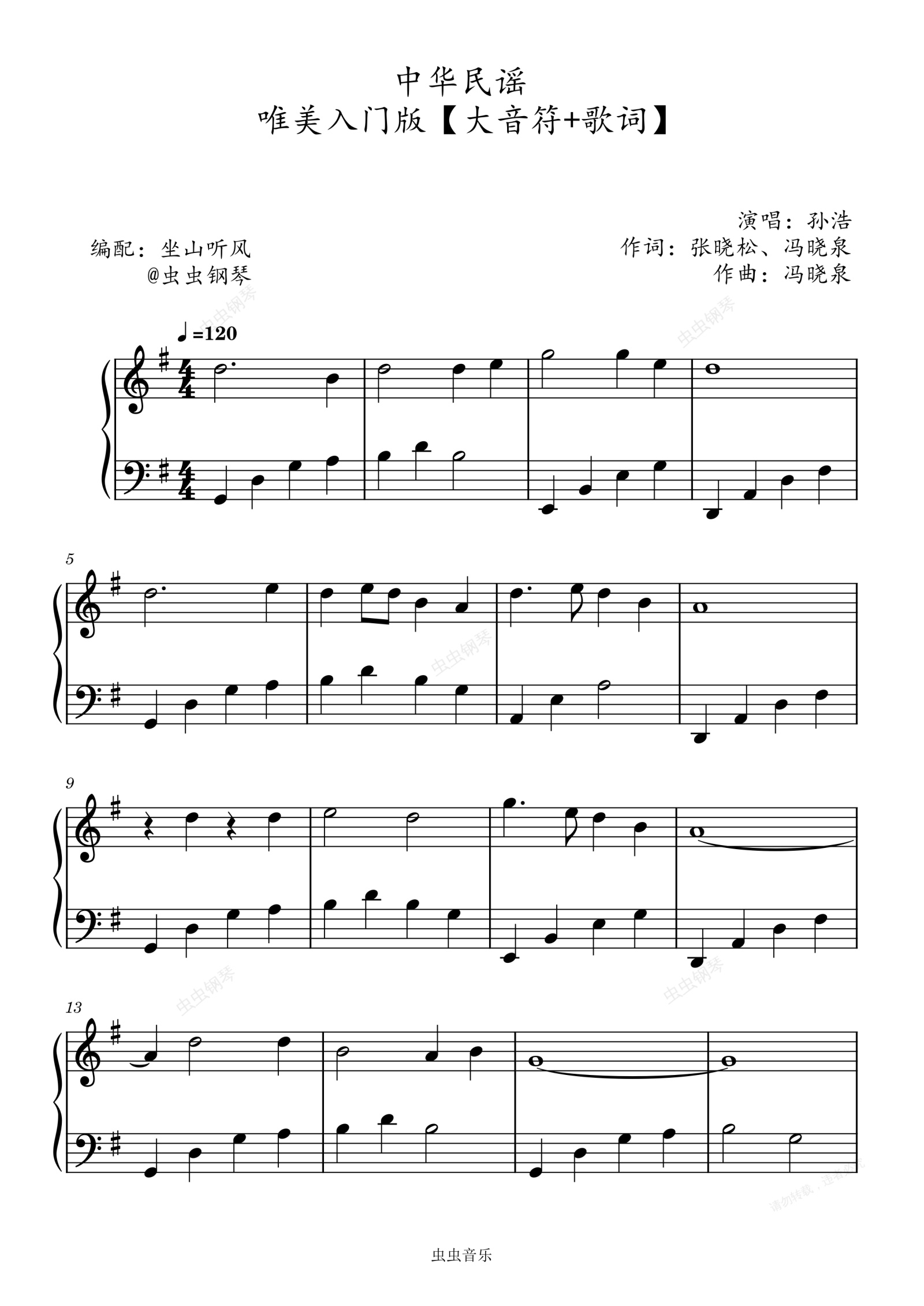 钢琴谱:中华民谣——唯美入门版【大音符+歌词】