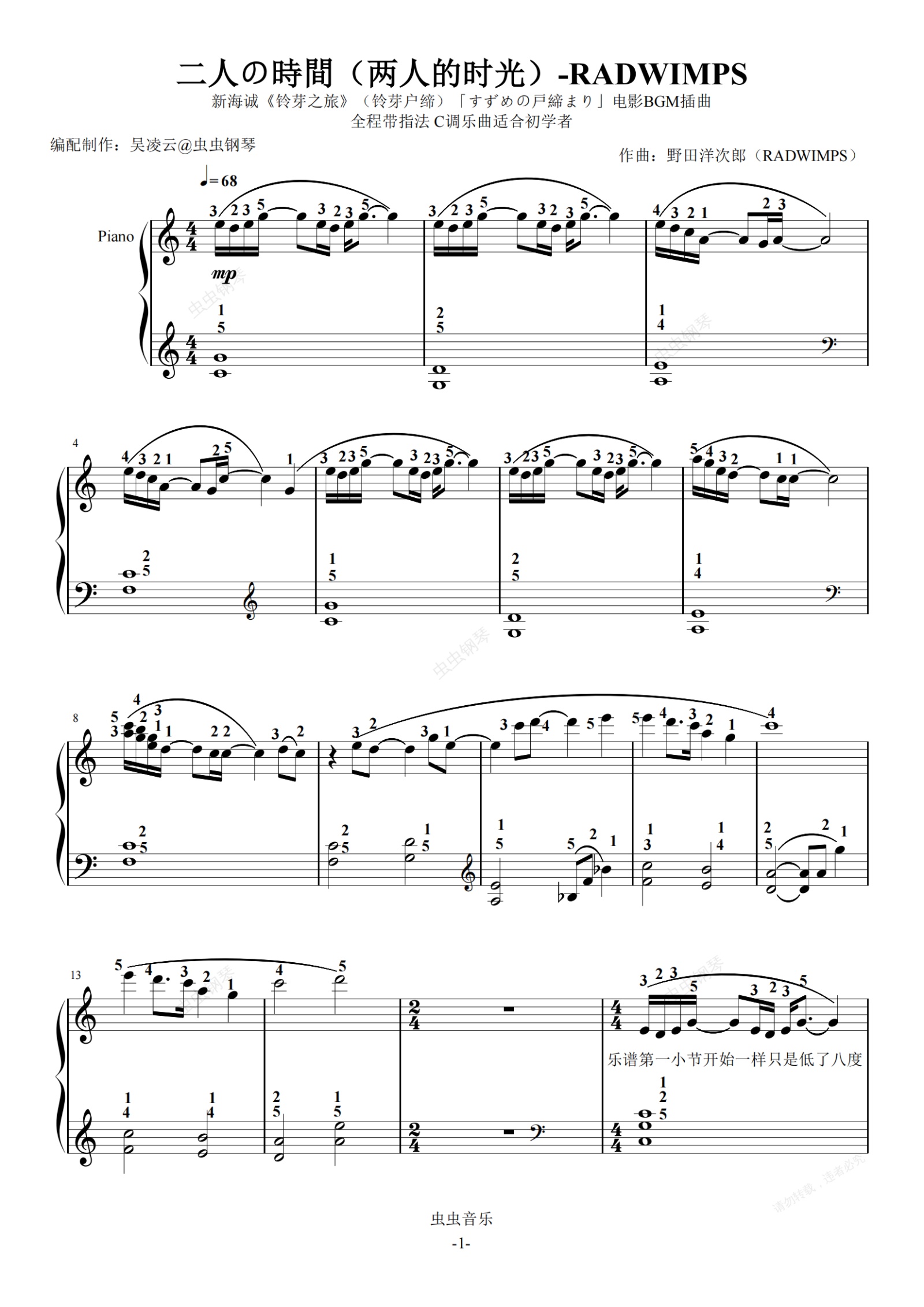 钢琴谱:二人の時間(两人的时光)-RADWIMPS 带指法初学者 新海诚《铃芽之旅》(铃芽户缔)「すずめの戸締まり」电影BGM插曲