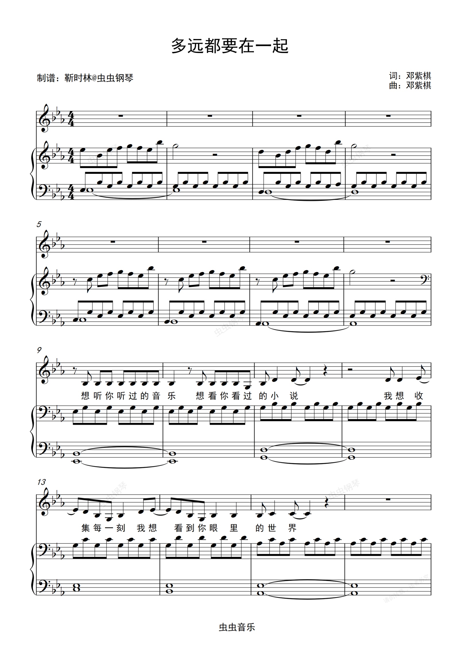 钢琴谱:《多远都要在一起》原调高还原弹唱谱