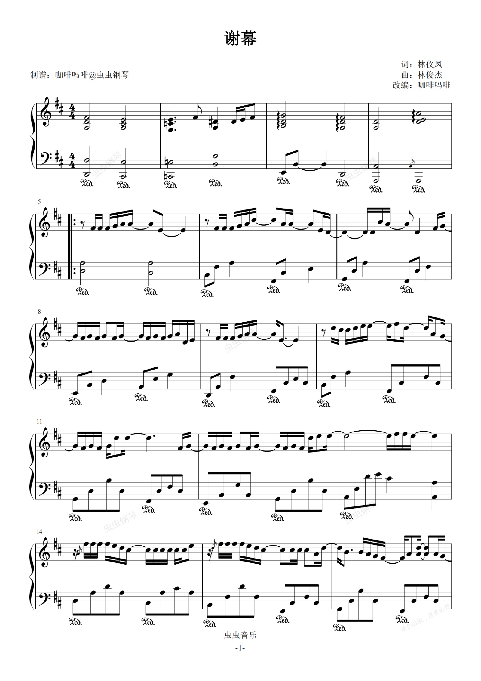 钢琴谱:谢幕-林俊杰 D调钢琴谱