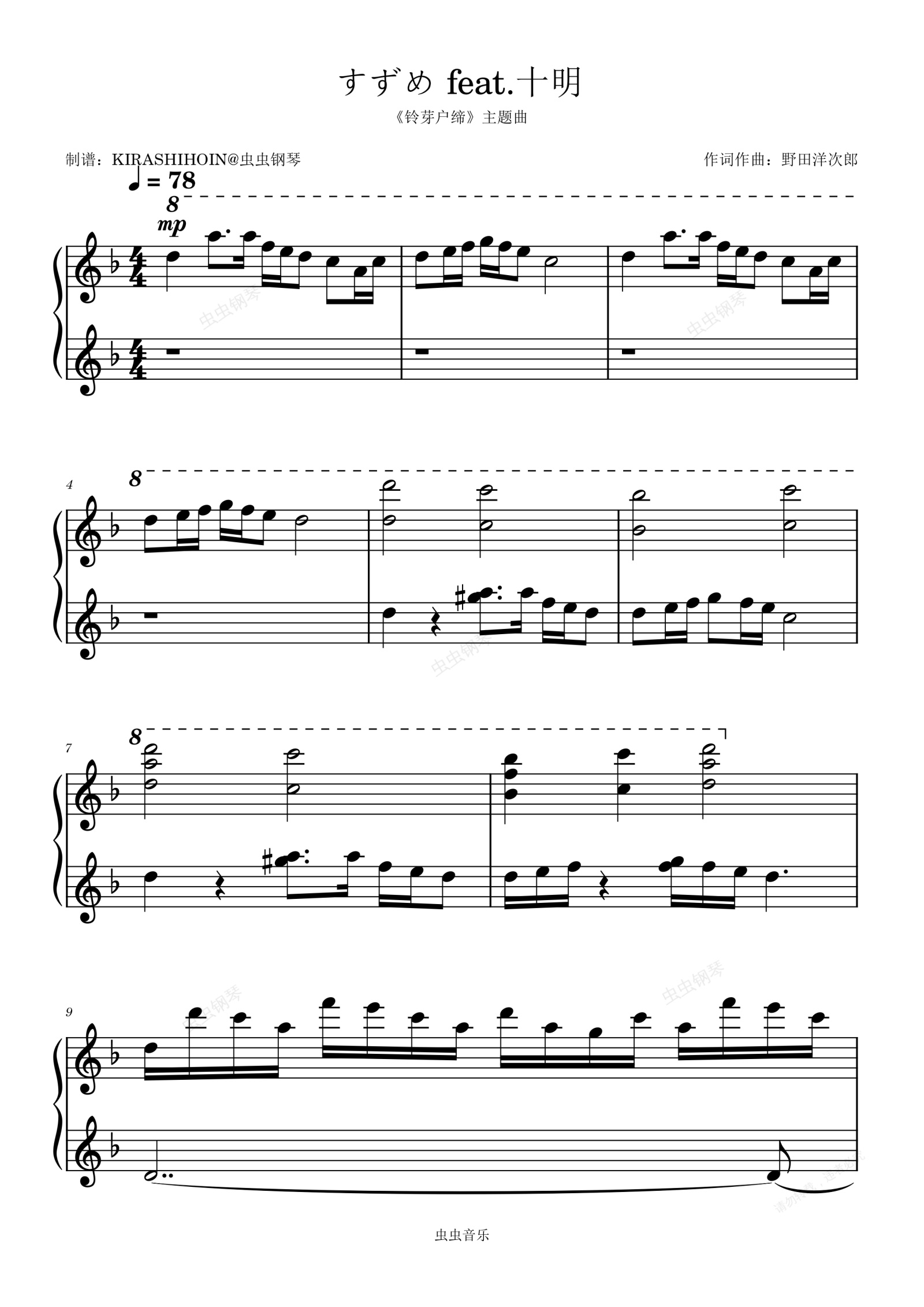 钢琴谱:すずめ feat.十明(《铃芽户缔/铃芽之旅》主题曲)- RADWIMPS
