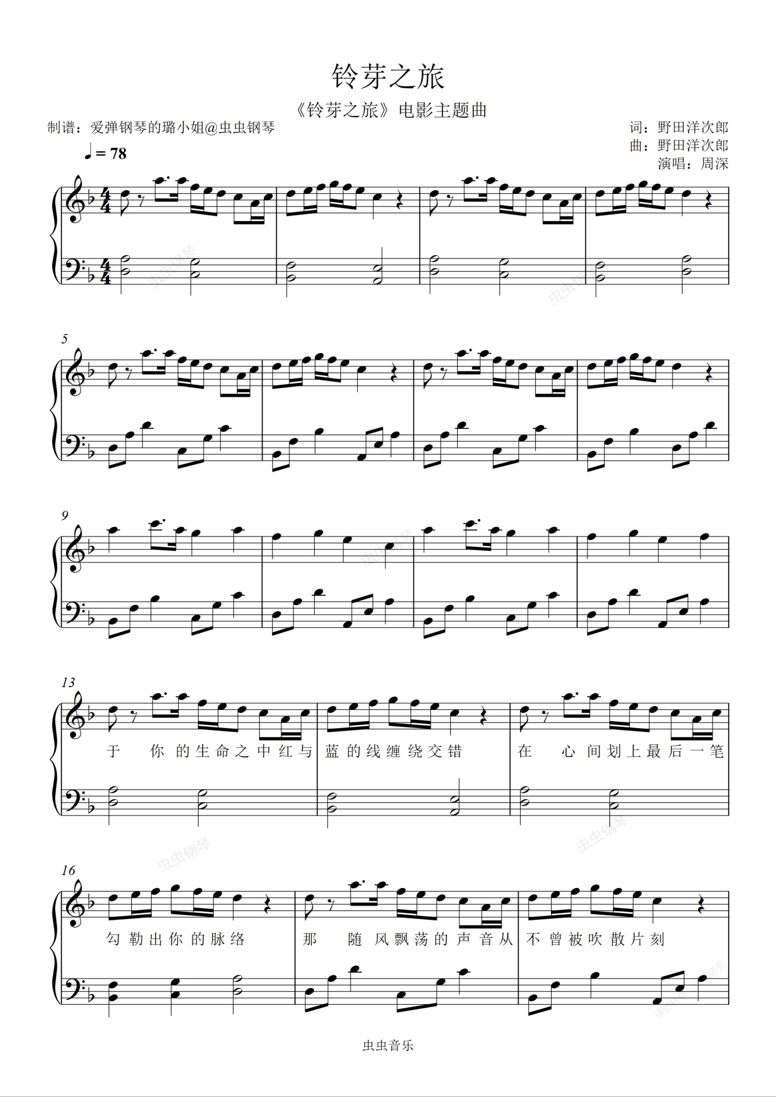 钢琴谱:铃芽之旅《铃芽之旅》主题曲 - F调简易版 - 附歌词