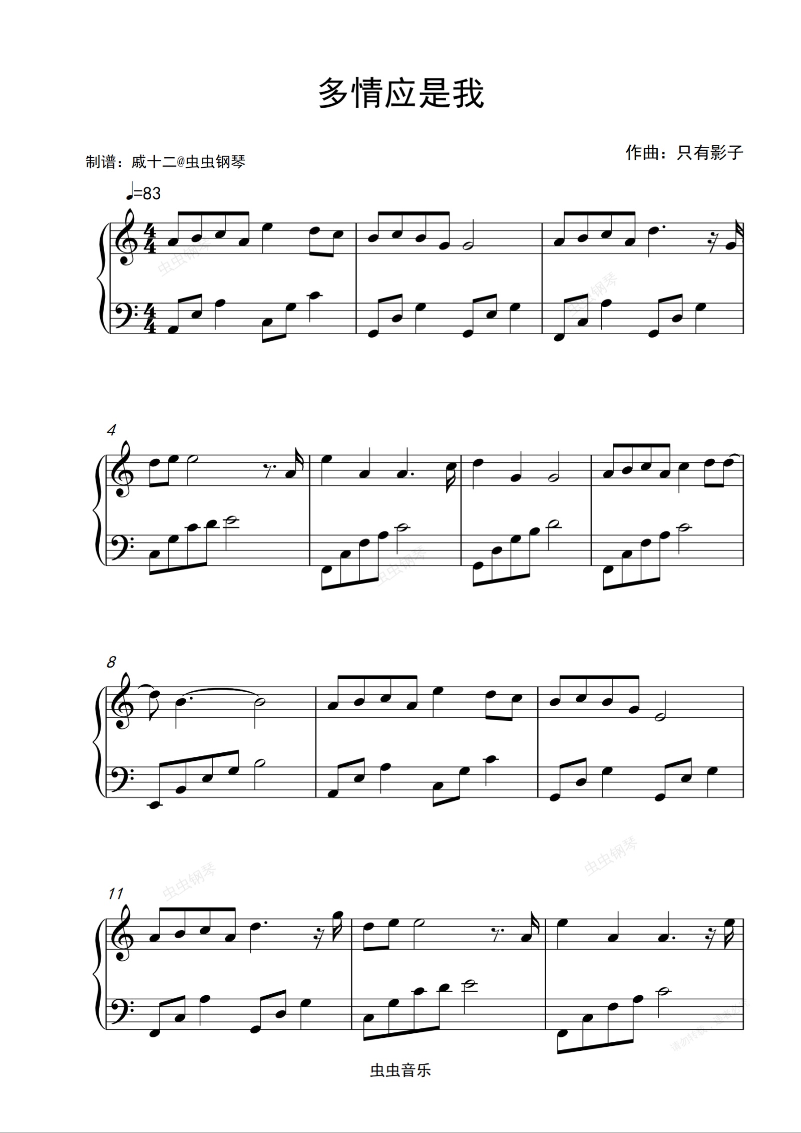 钢琴谱:多情应是我-C调简单版