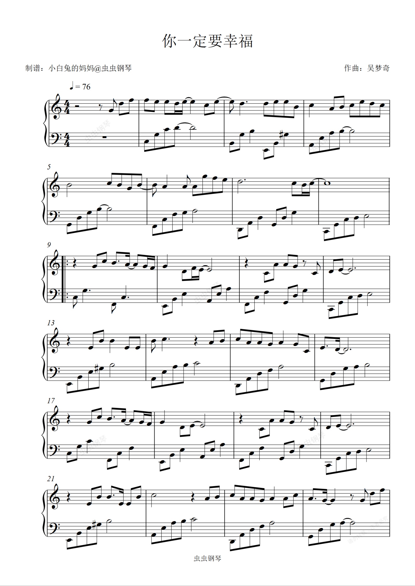 钢琴谱:《你一定要幸福》何洁 C调简易版