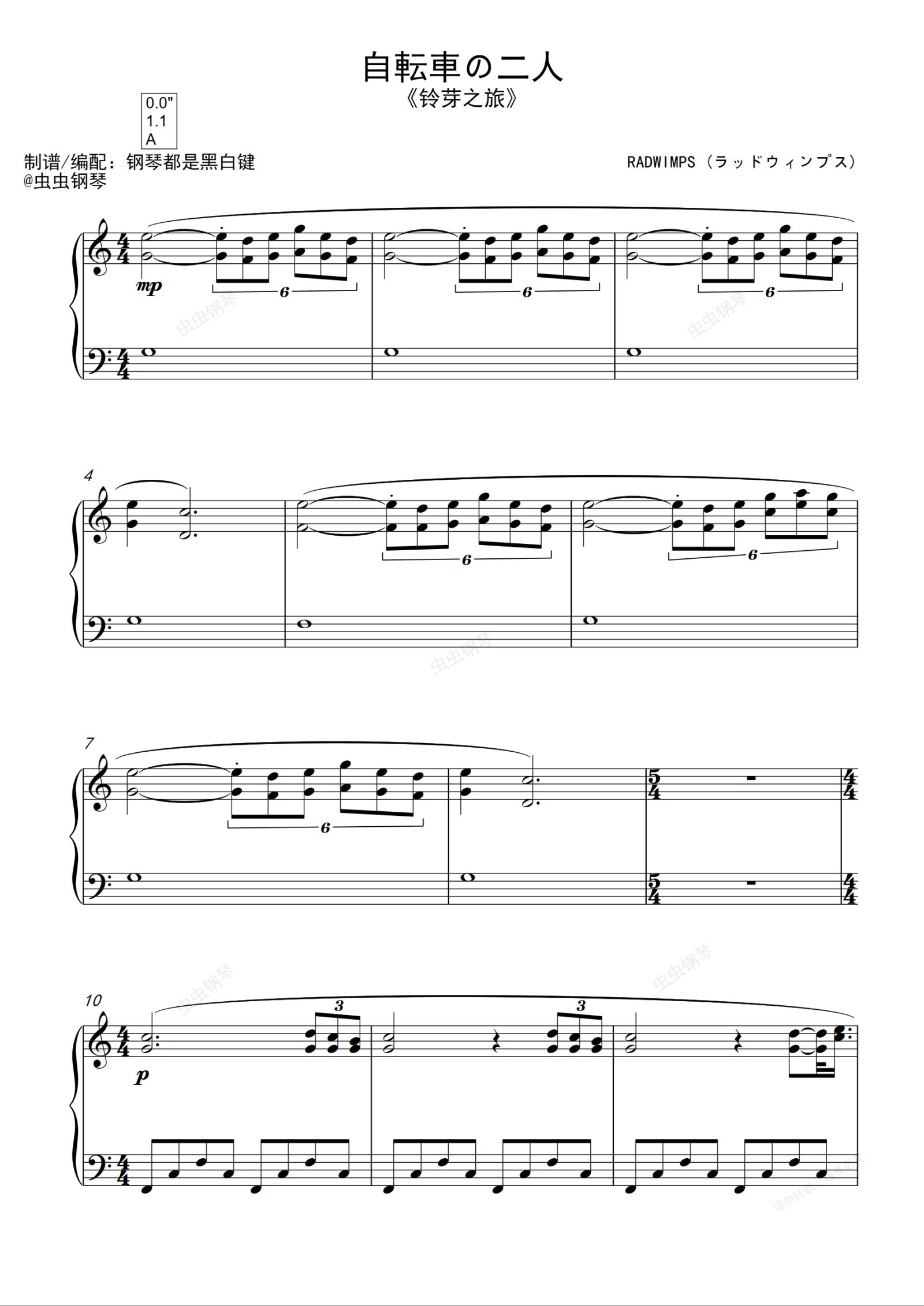 钢琴谱:《铃芽之旅》- 自転車の二人 [超好听钢琴独奏]