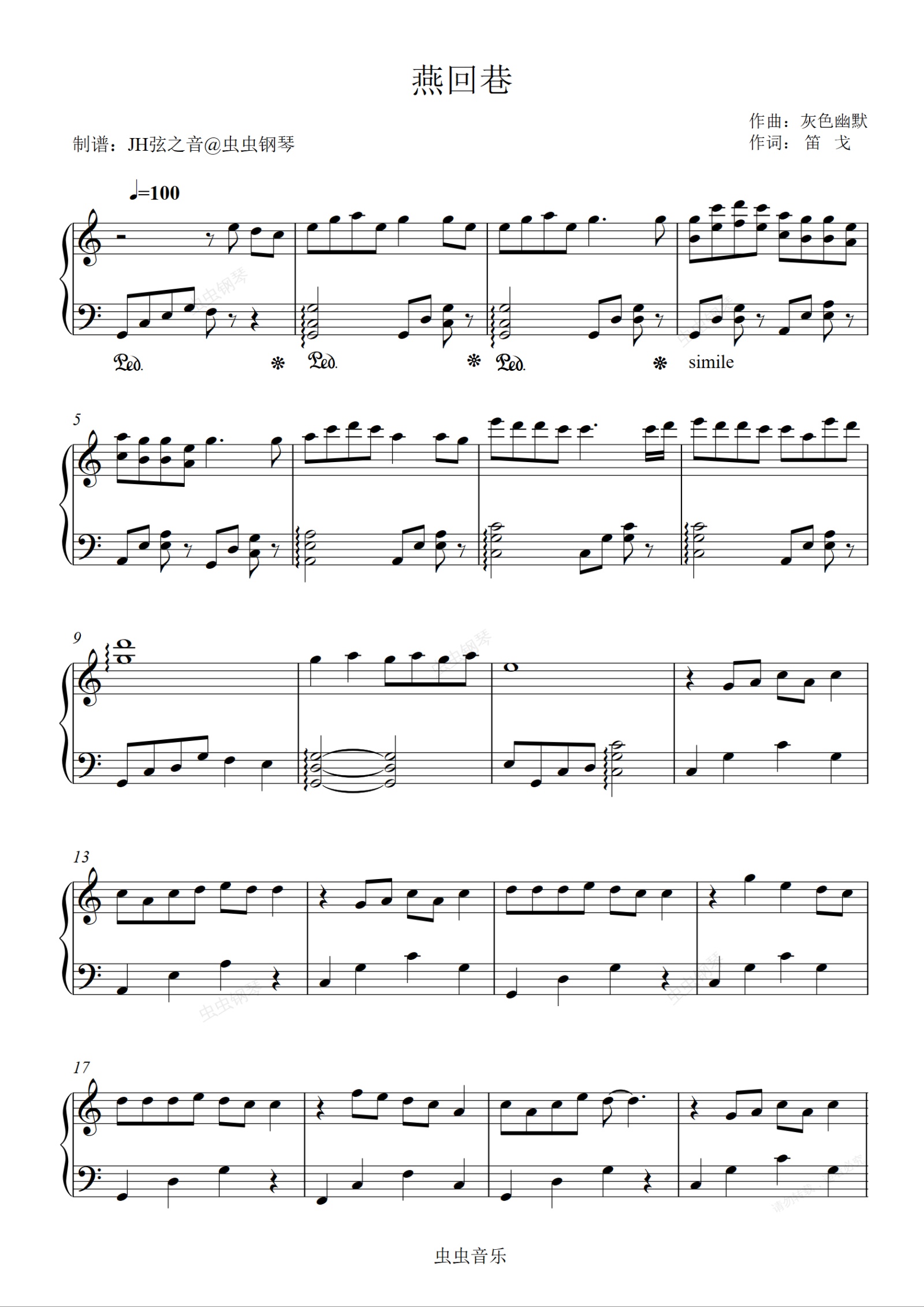 钢琴谱:燕回巷-灰色幽默-C调简单版