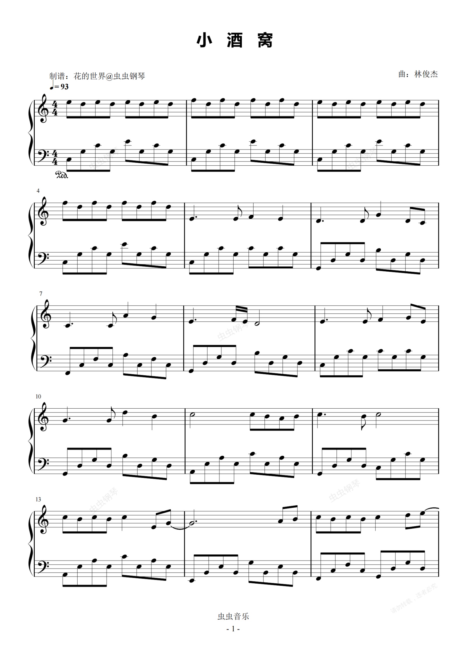 钢琴谱:小酒窝 C调简易版 林俊杰/蔡卓妍