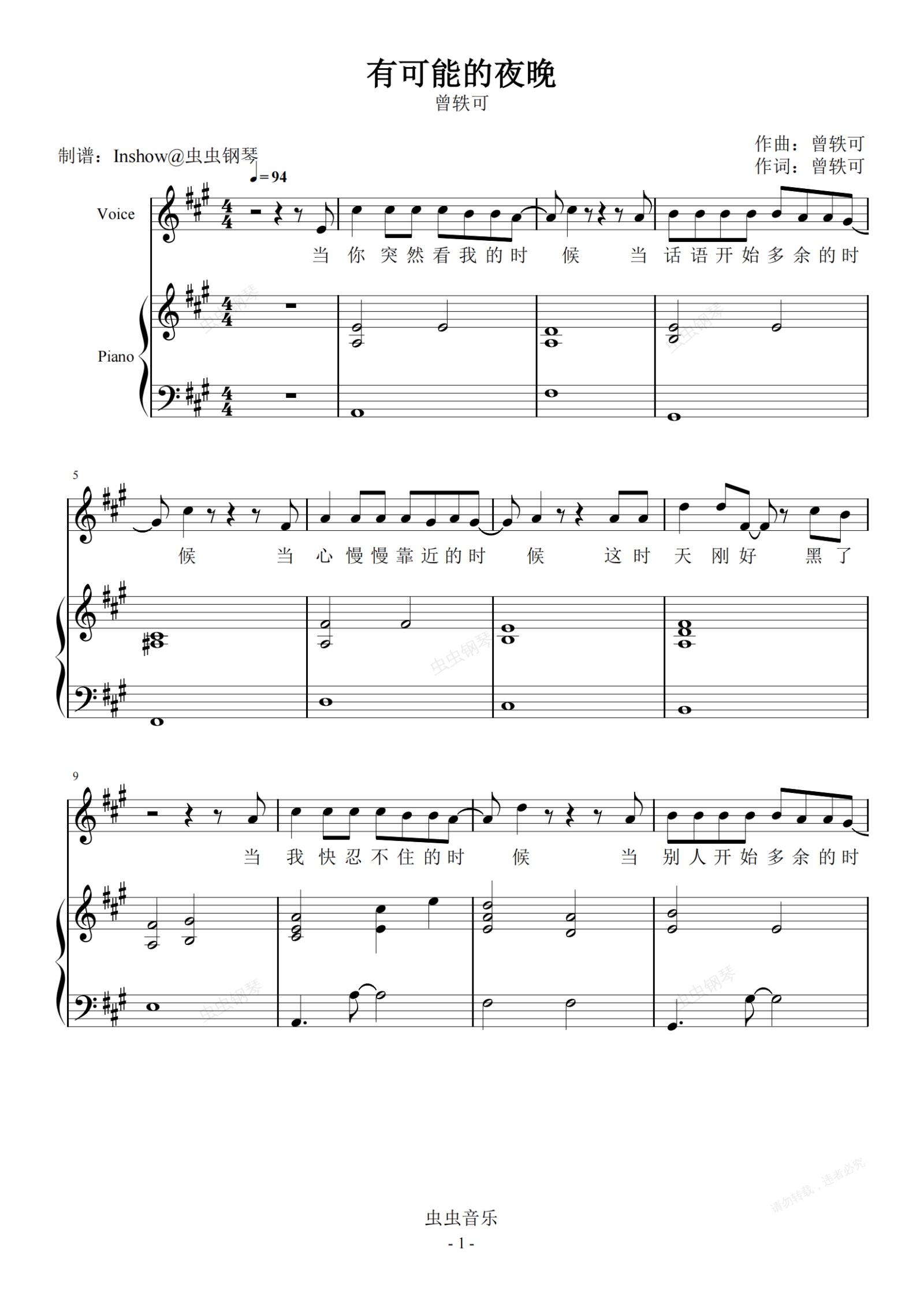 钢琴谱:有可能的夜晚【弹唱】-曾轶可 -