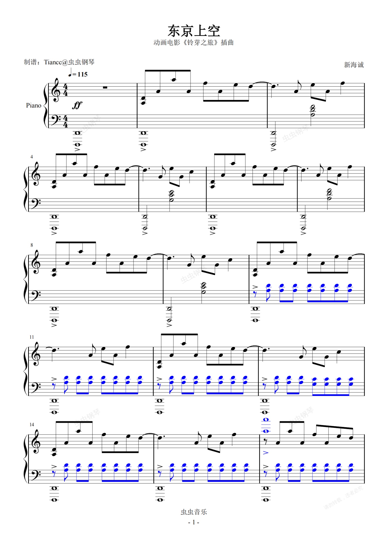 钢琴谱:《东京上空》动画电影《铃芽之旅》插曲