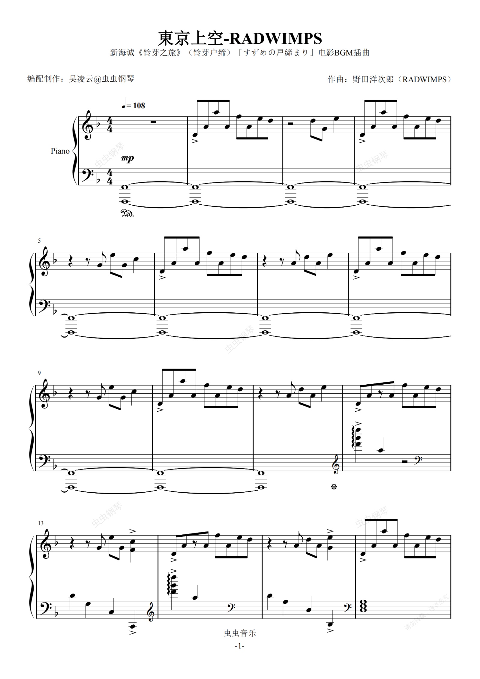 钢琴谱:東京上空-RADWIMPS 新海诚《铃芽之旅》(铃芽户缔)「すずめの戸締まり」电影BGM插曲