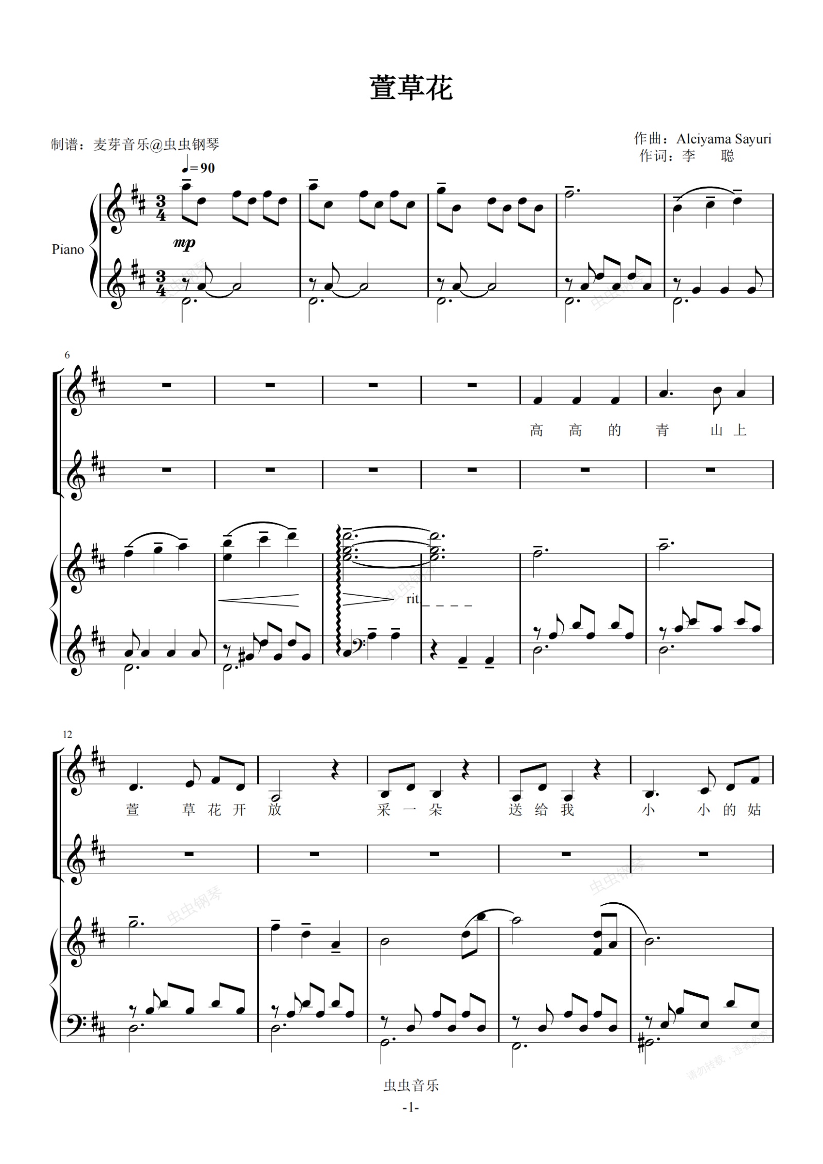 钢琴谱:萱草花 小提琴二重奏 二声部对唱