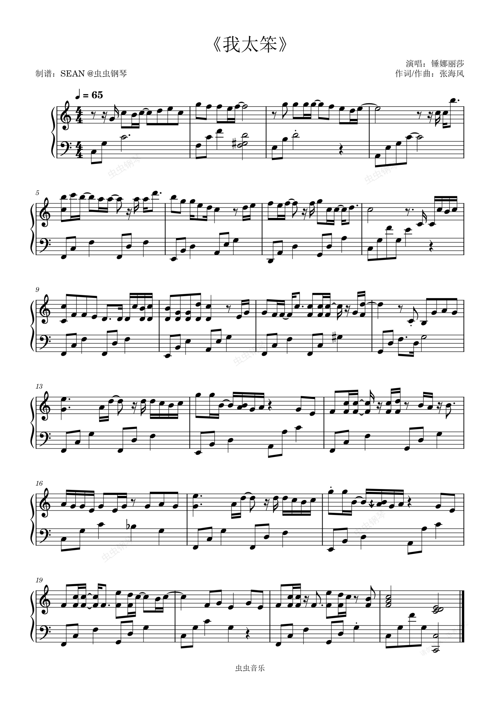 钢琴谱:《我太笨》锤娜丽莎-C调 『 SEAN 编配 』简约完美版
