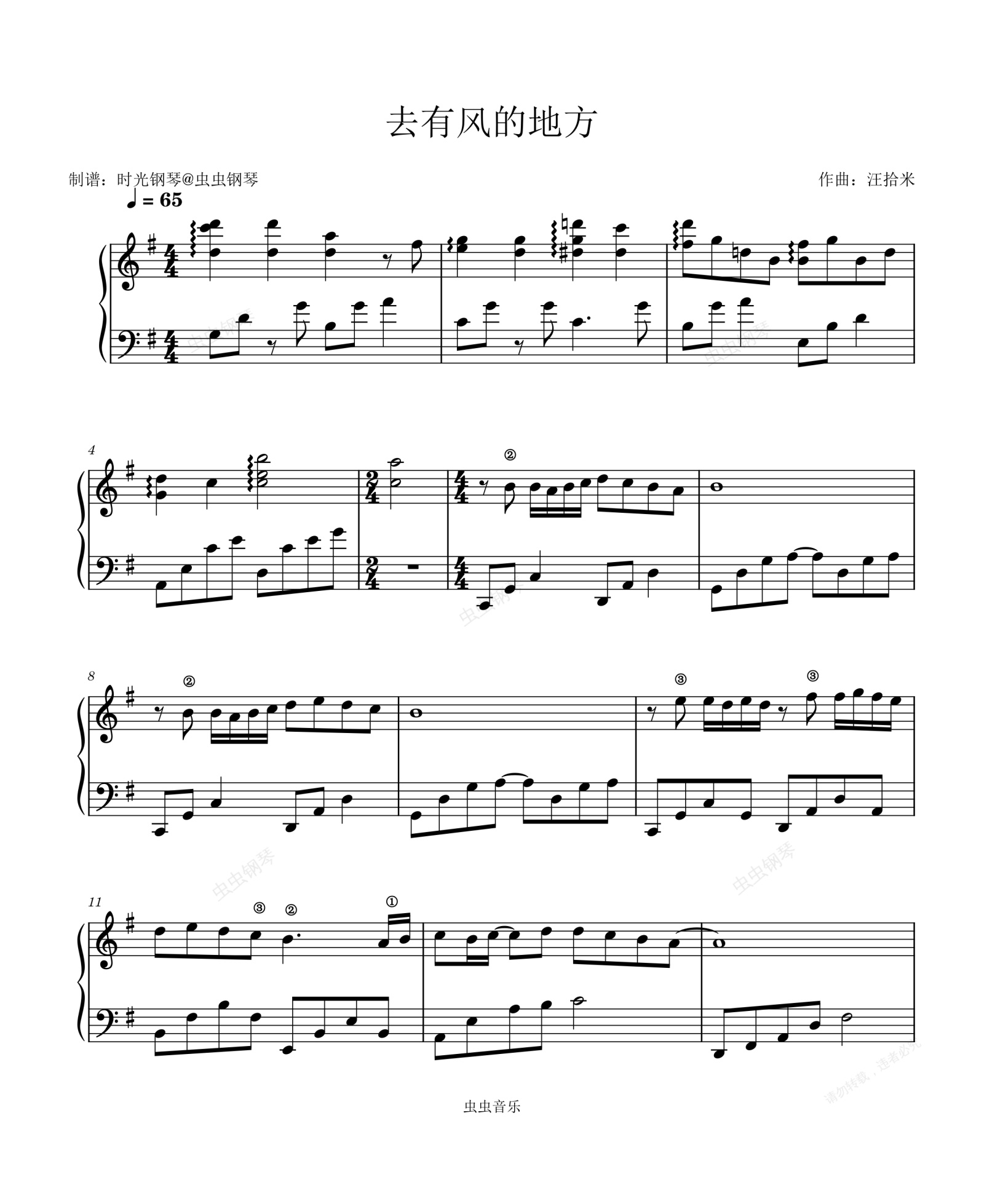钢琴谱:去有风的地方 G调 郁可唯 简单动听