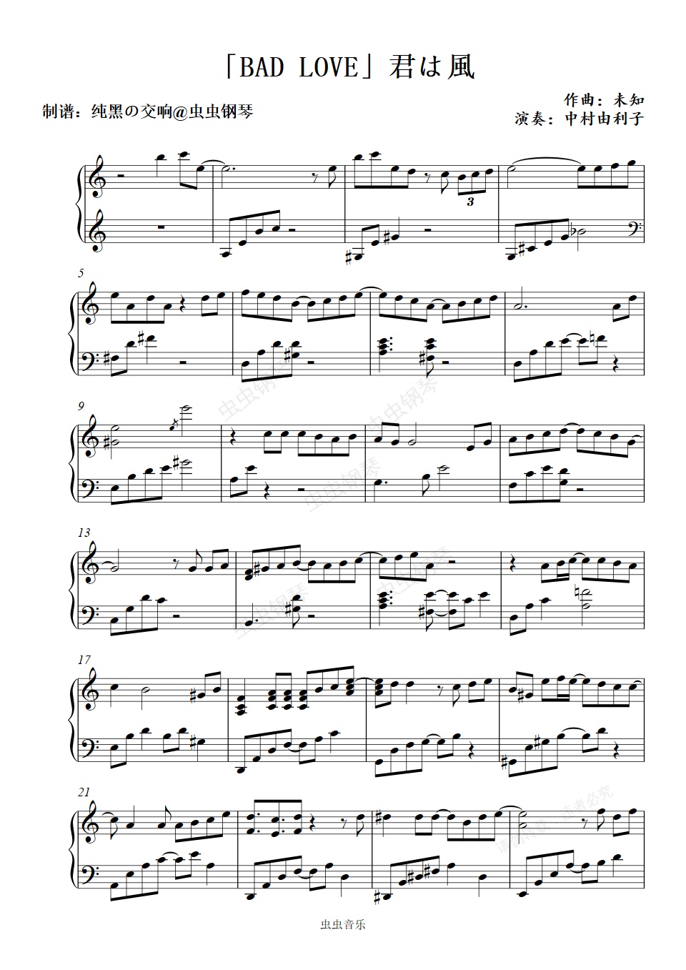 钢琴谱:「BAD LOVE」君は風-中村由利子