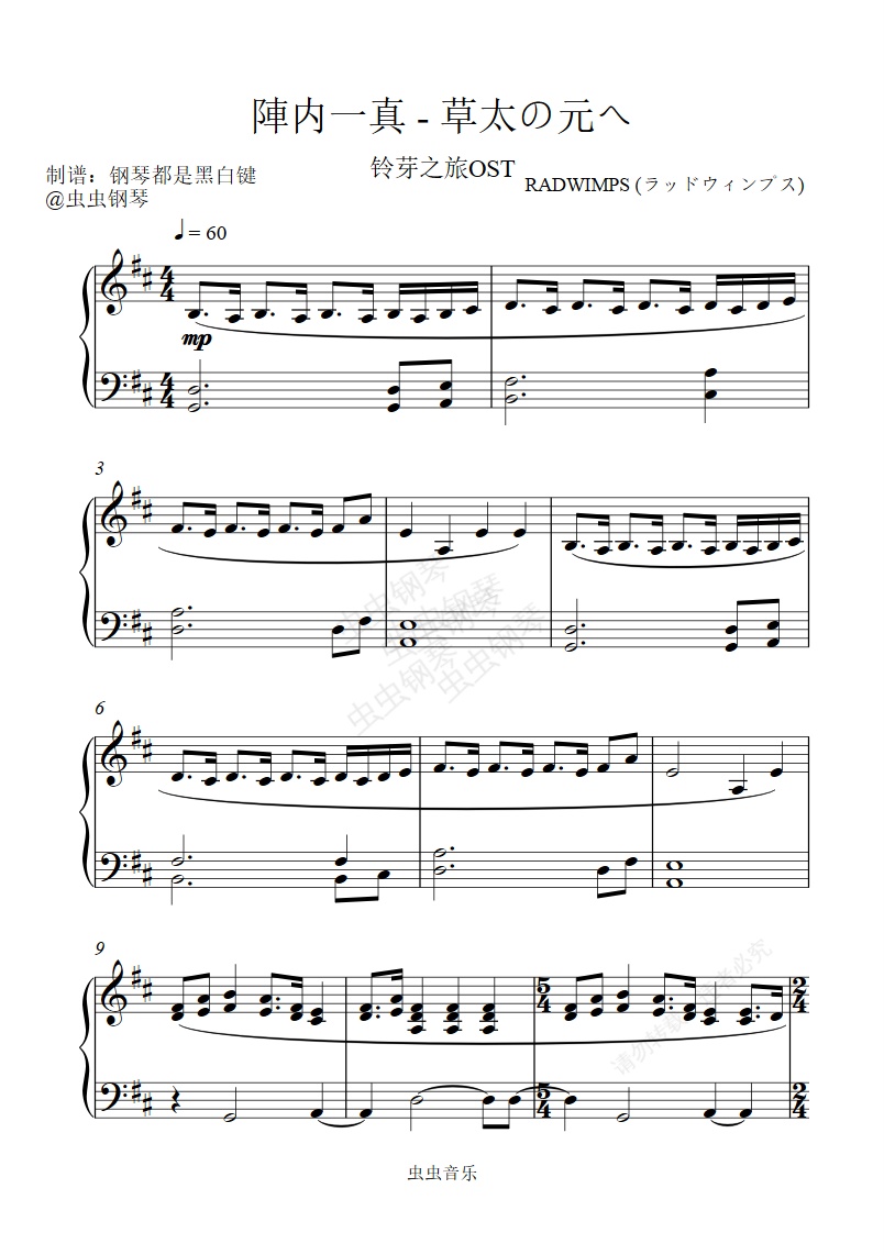 钢琴谱:铃芽之旅OST - 陣内一真 - 草太の元へ 【好听到爆炸纯钢琴独奏】