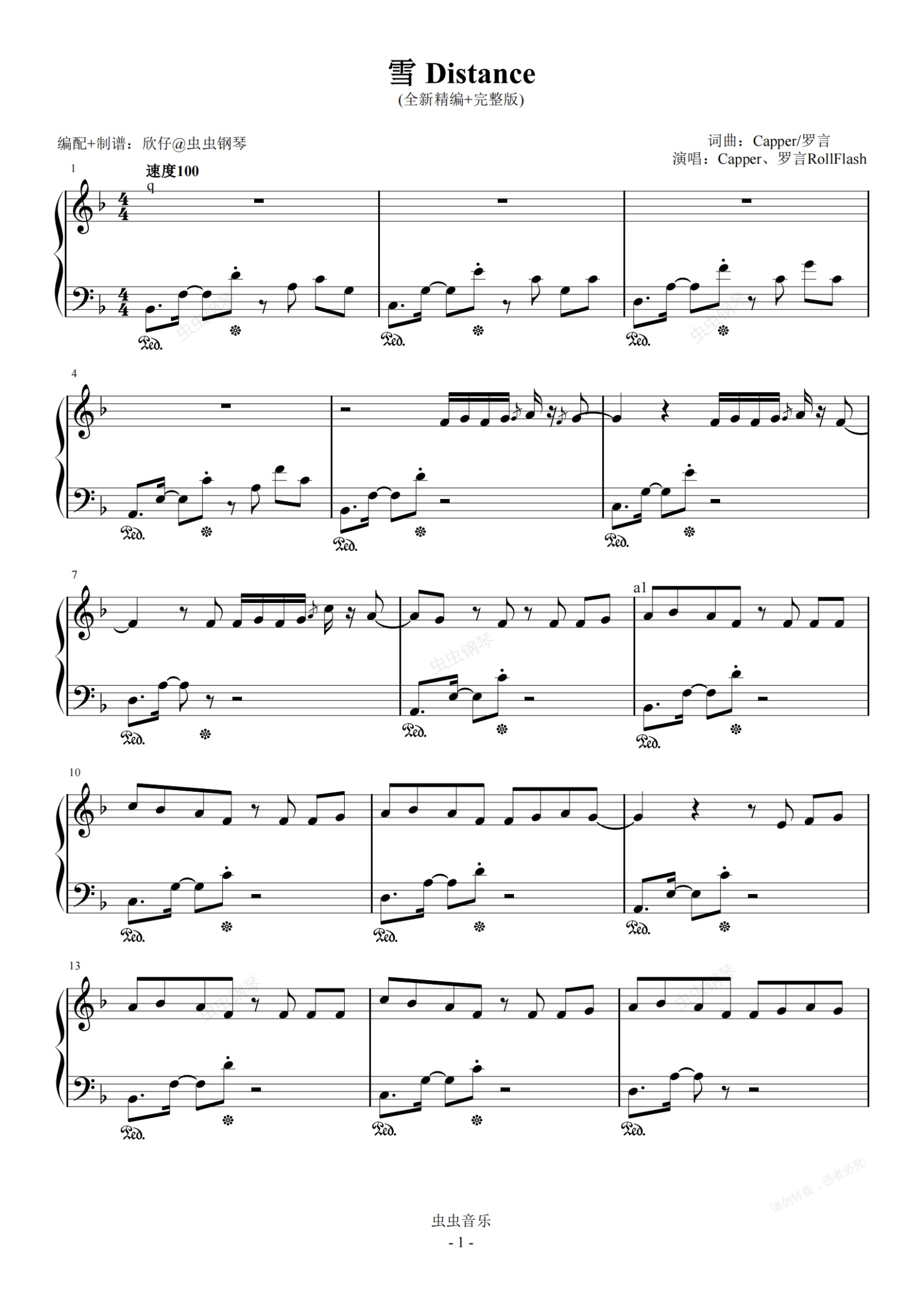 钢琴谱:d-《雪 Distance》(Capper、罗言RollFlash、完整版)