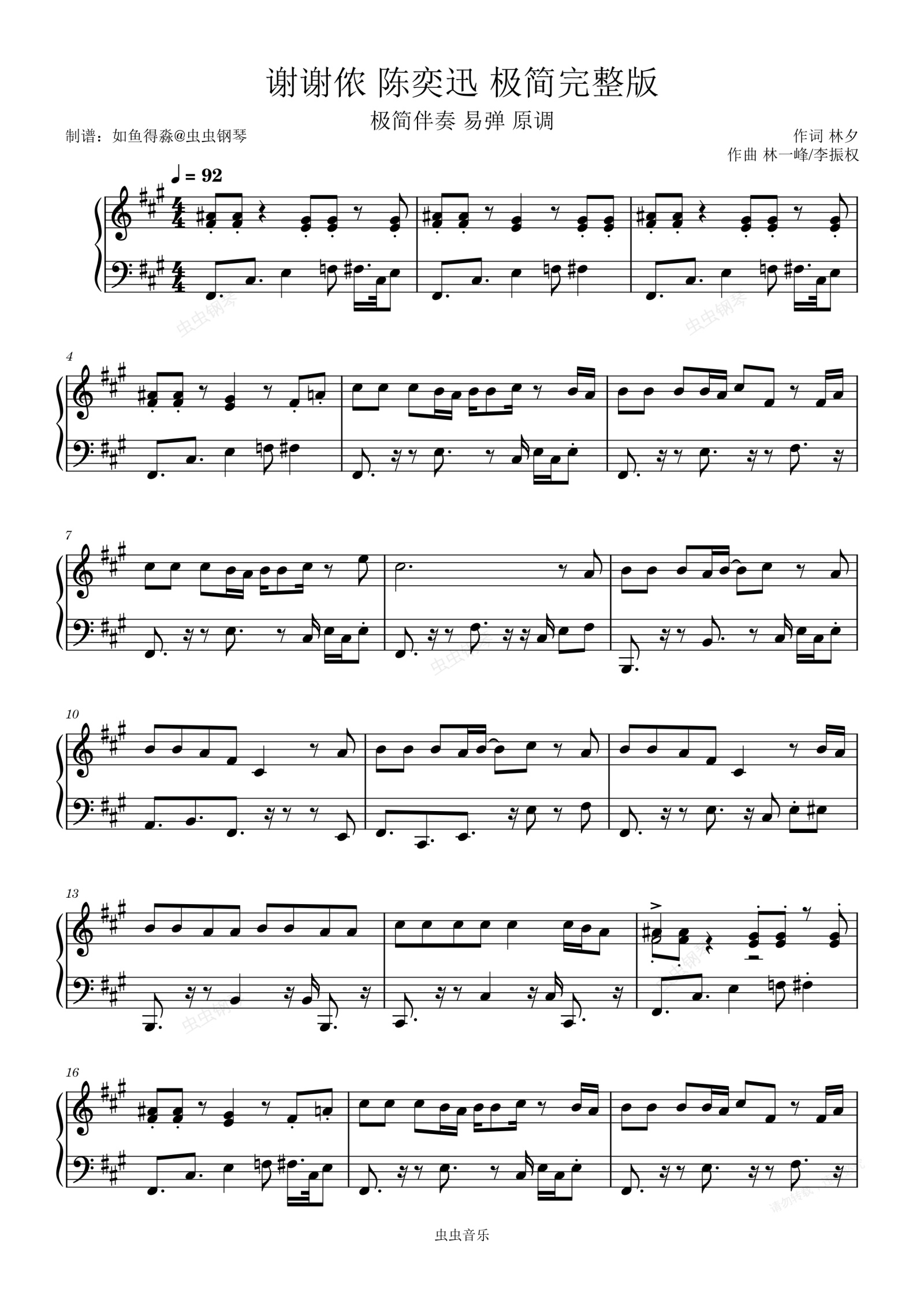 钢琴谱:谢谢侬 陈奕迅 抖音极简完整版 原调