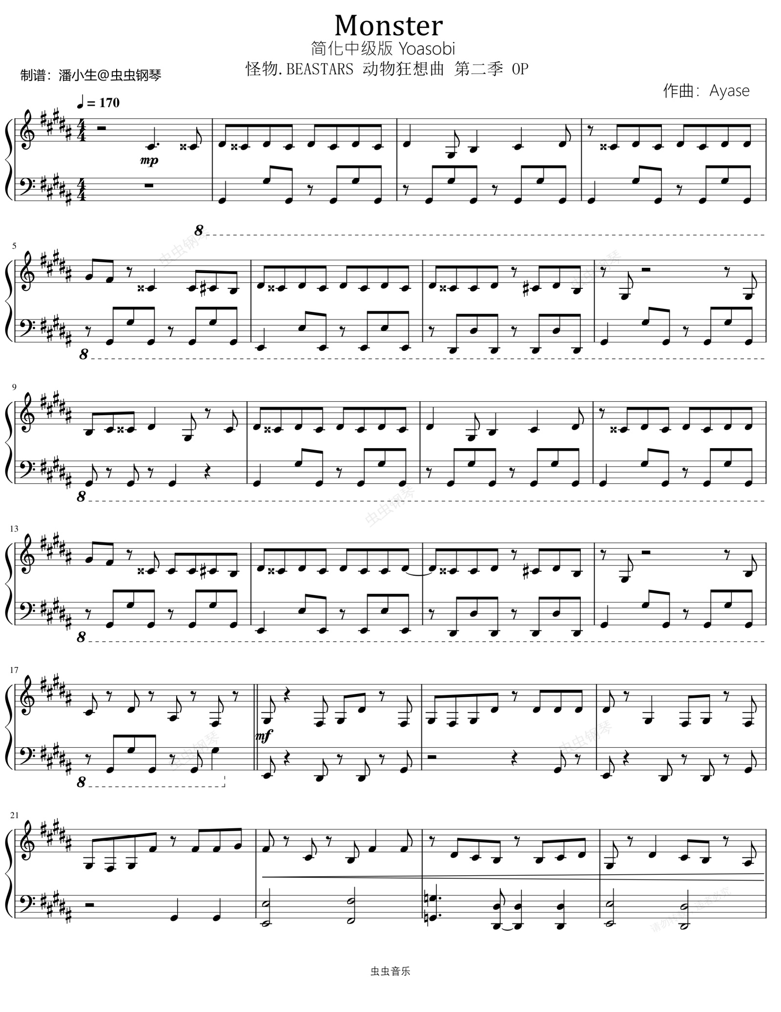 钢琴谱:怪物 Monster 简化中级版 Yoasobi 动物狂想曲 Beastars