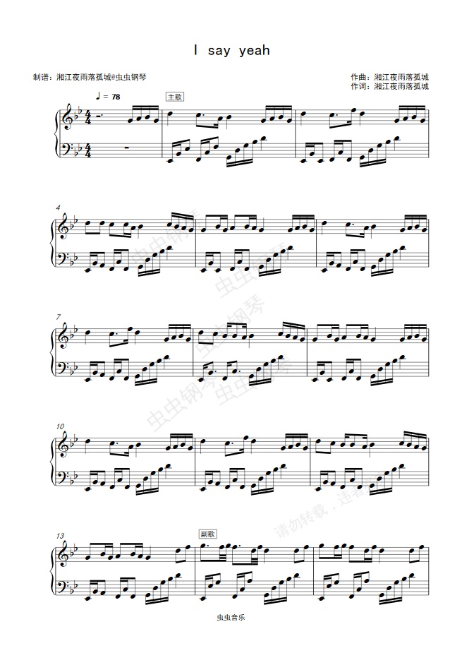 钢琴谱:I say yeah-湘江夜雨落孤城