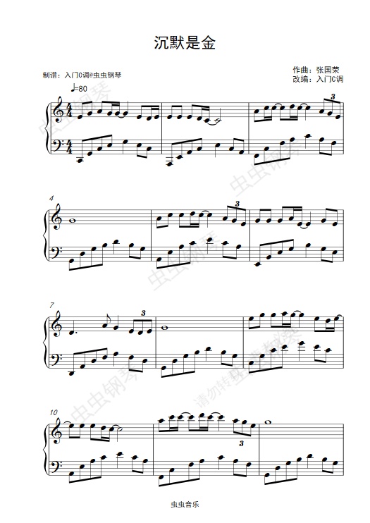 钢琴谱:张国荣《沉默是金》入门C调简单抒情版