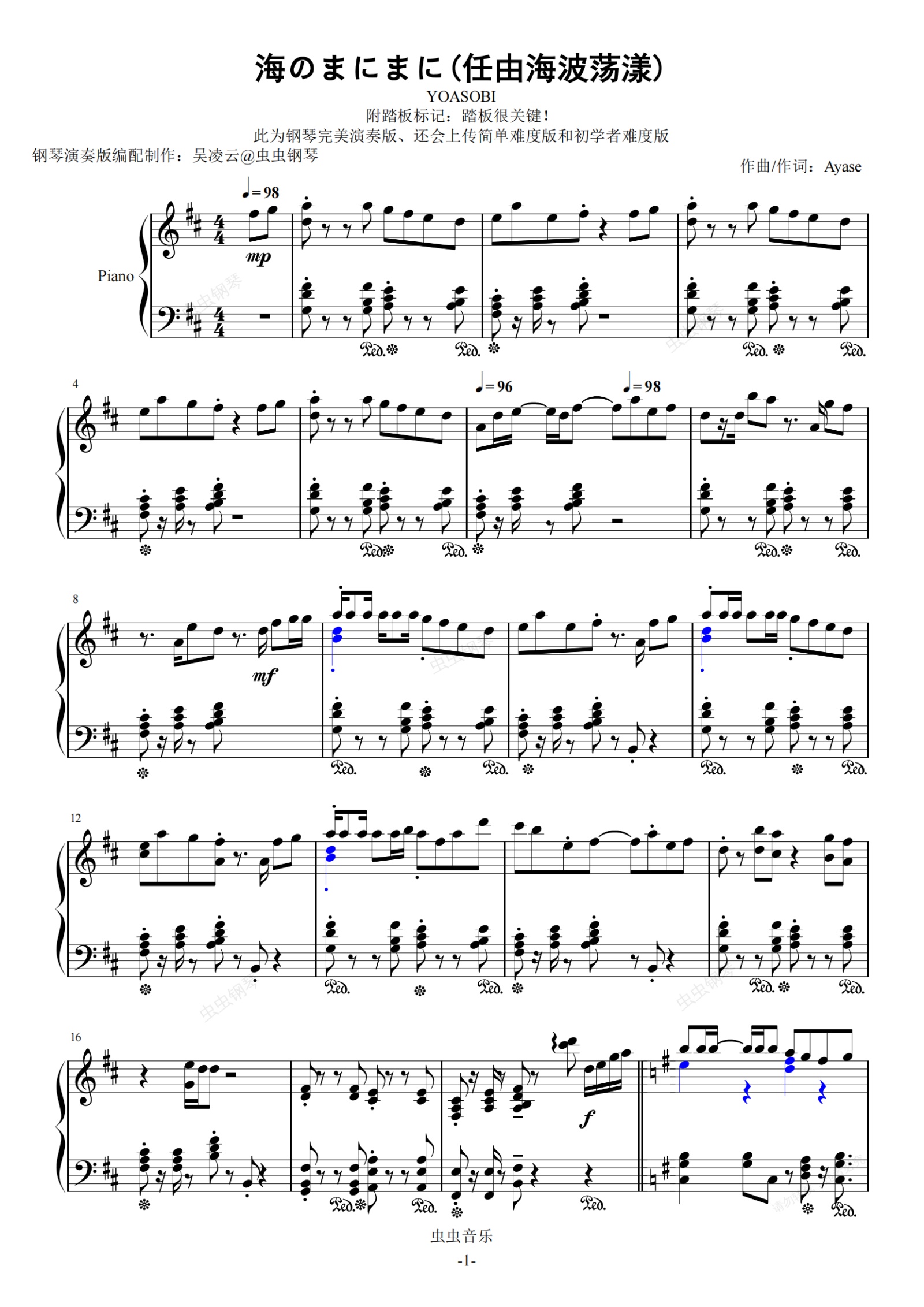钢琴谱:海のまにまに(任由海波荡漾)-YOASOBI 吴凌云钢琴完美演奏版 标记踏板