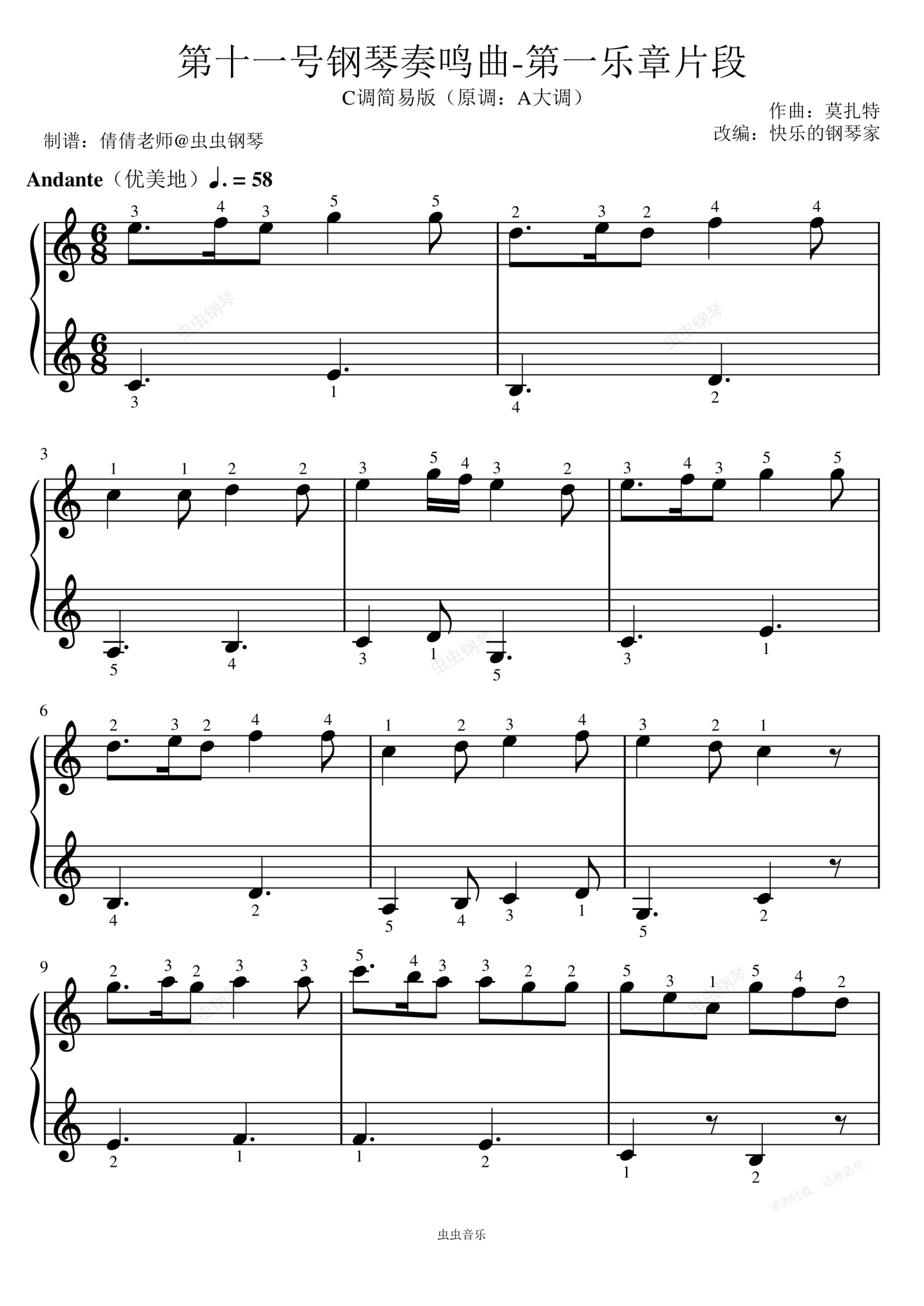 钢琴谱:第十一号钢琴奏鸣曲第一章片段-C调初学简易版-莫扎特