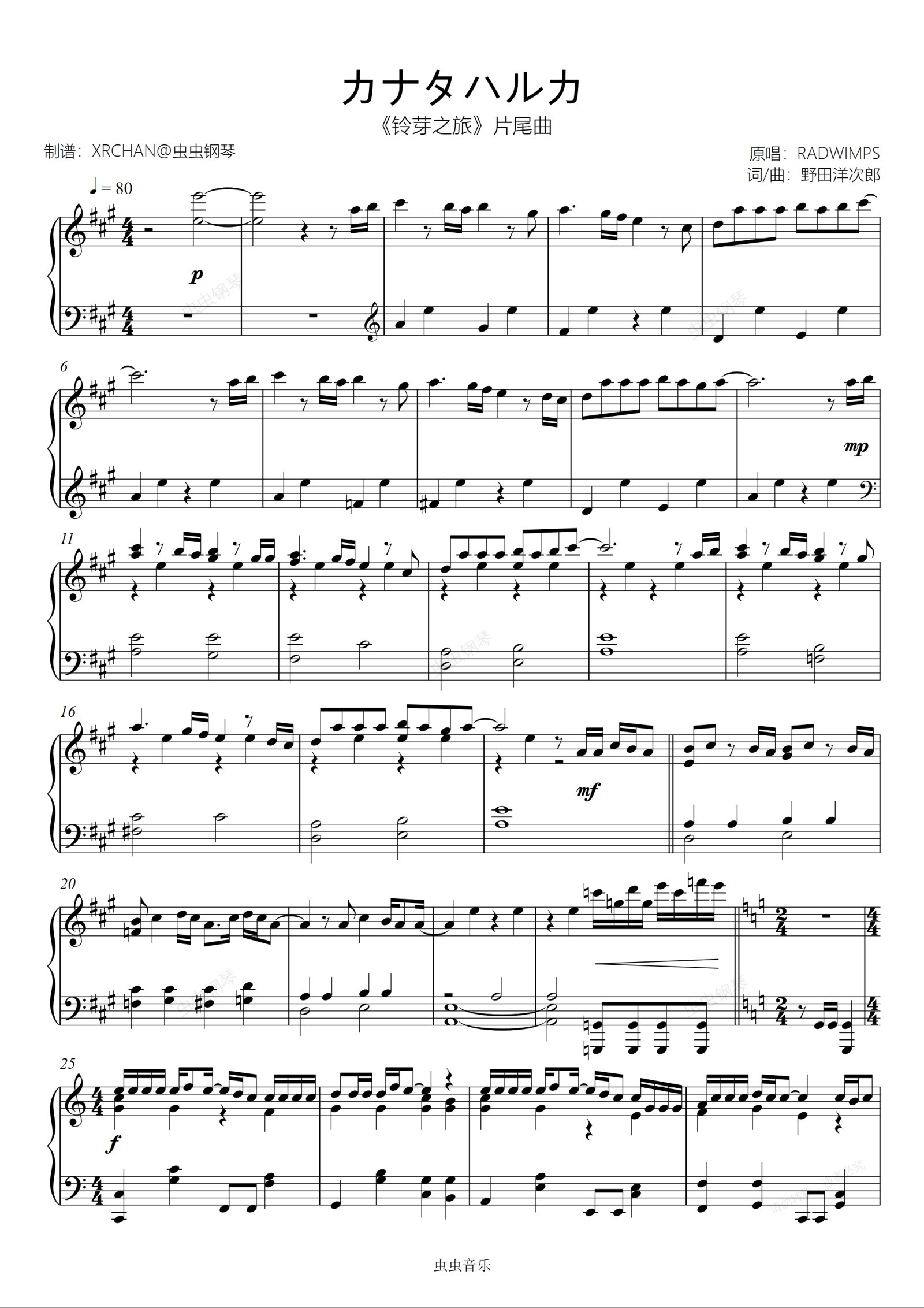 钢琴谱:《铃芽之旅》ED カナタハルカ(Short ver.)