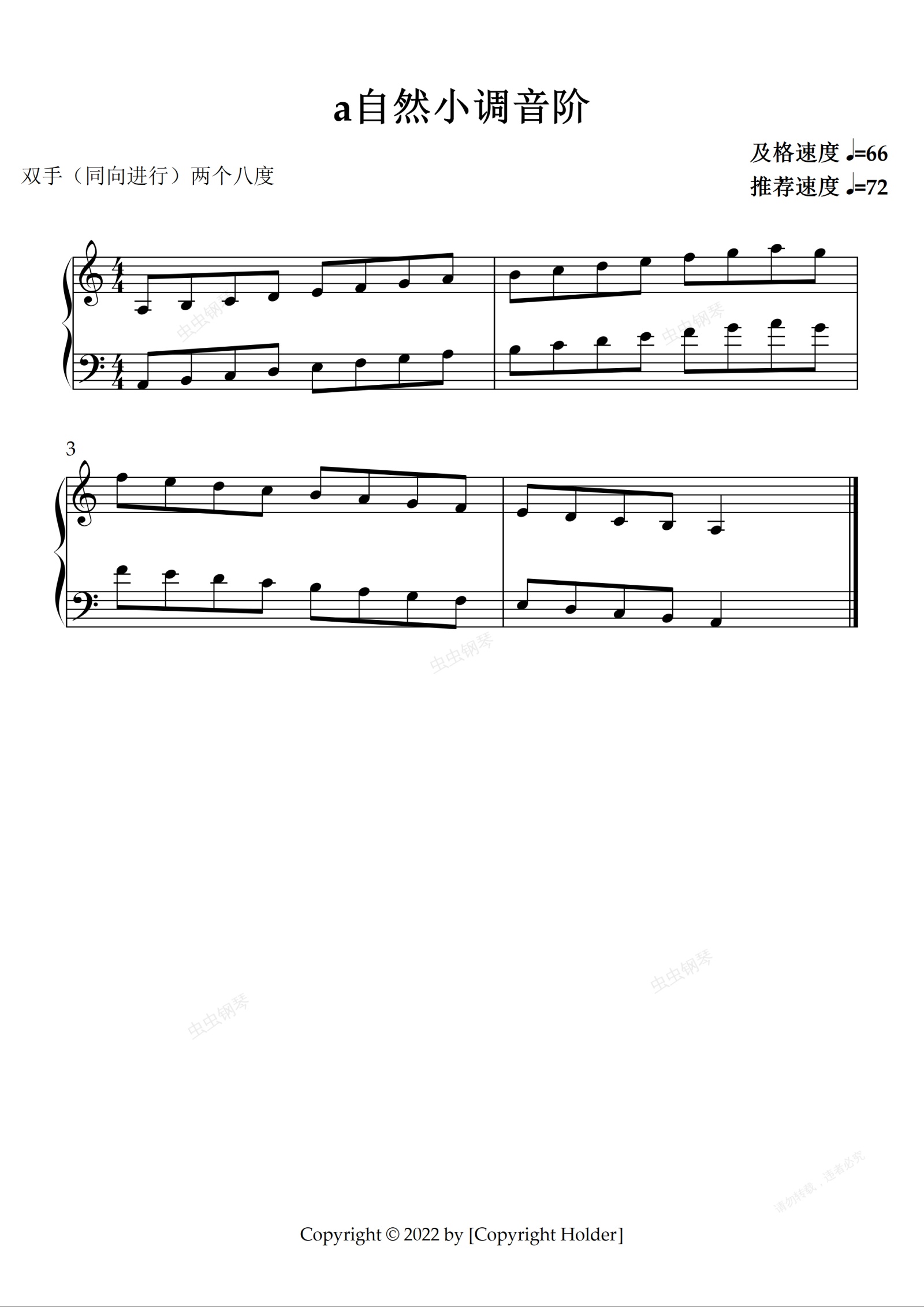 钢琴谱:a自然小调音阶 (双手 同向进行 两个八度)