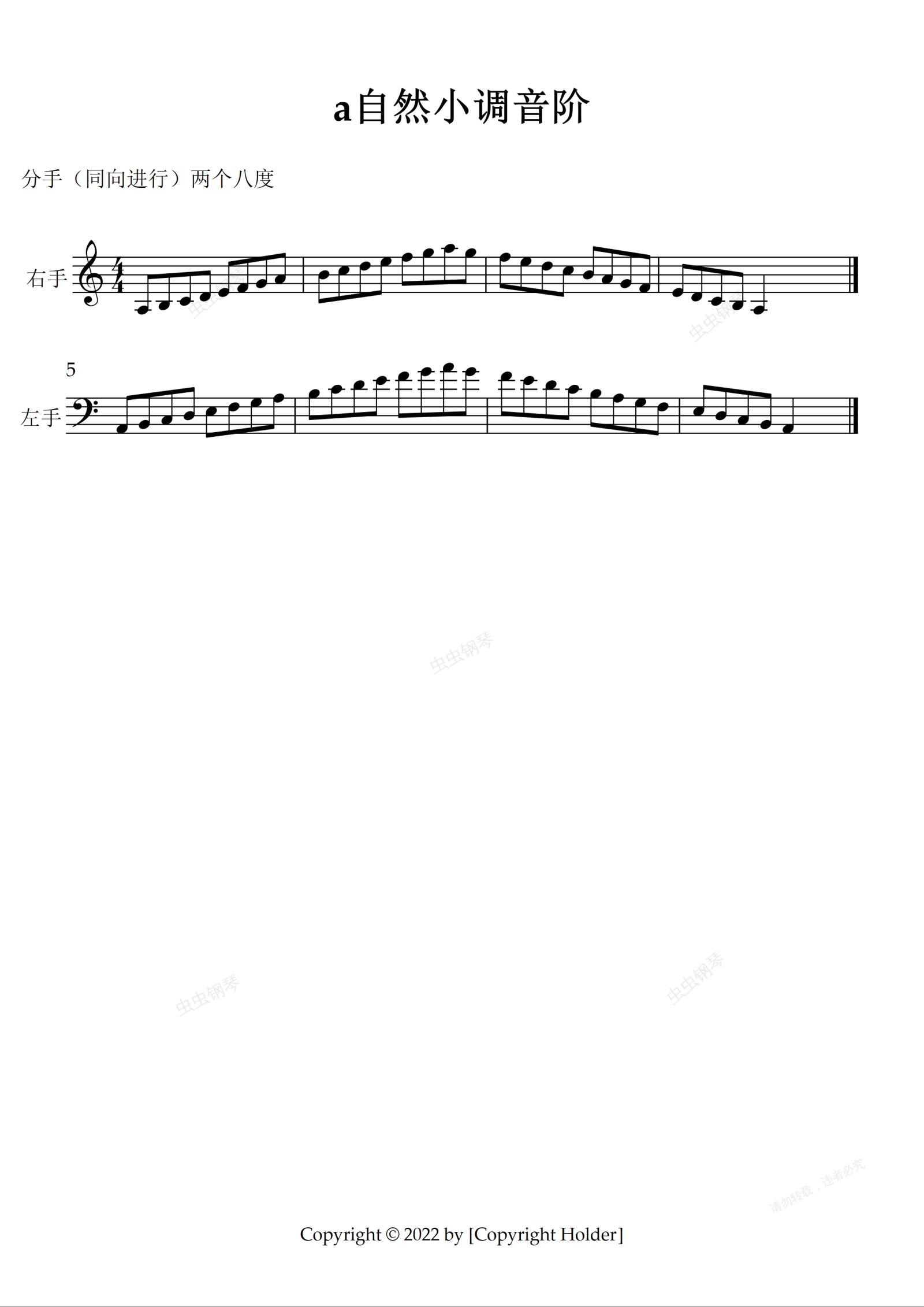 钢琴谱:a自然小调音阶 (分手 同向进行 两个八度)